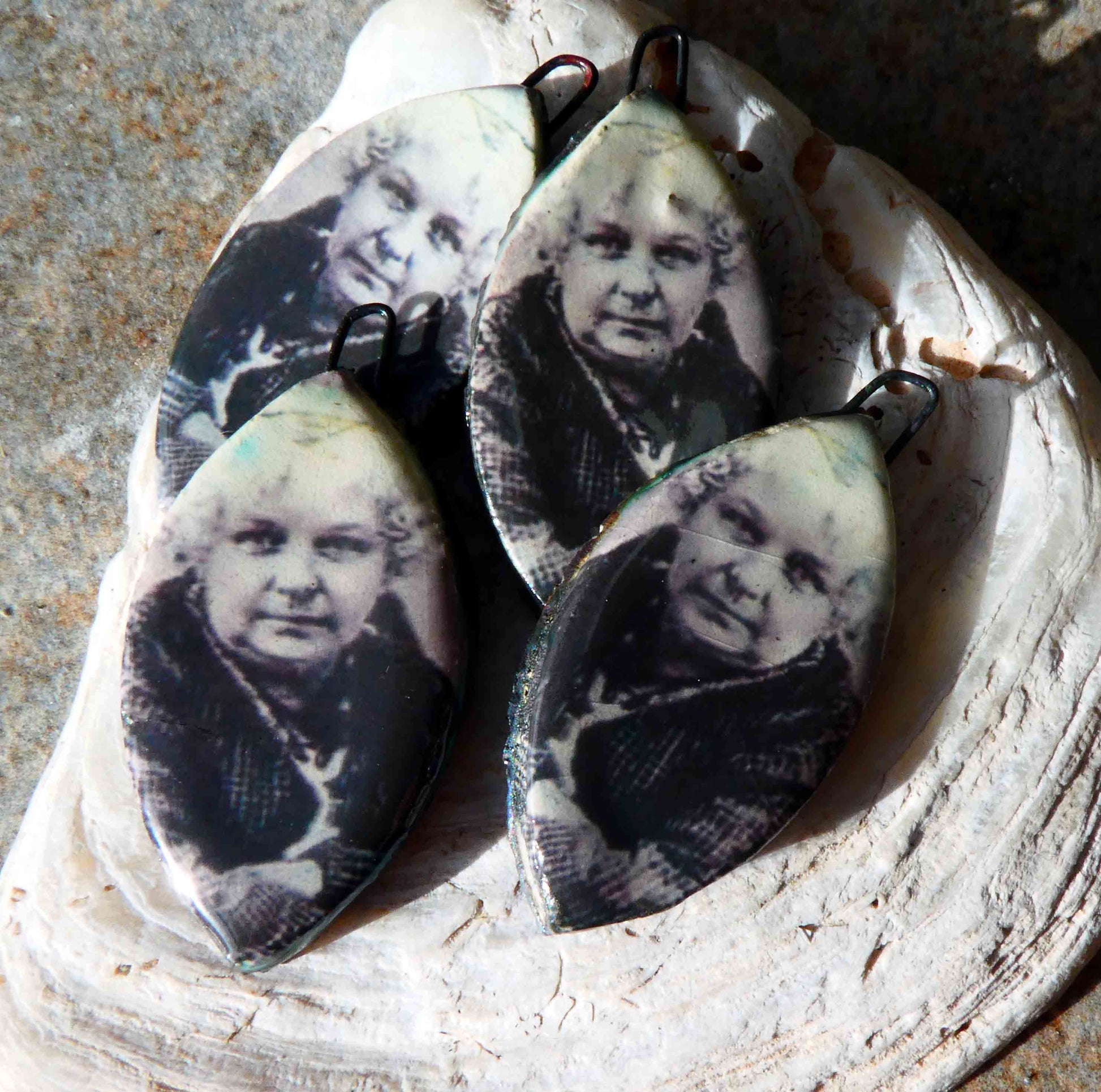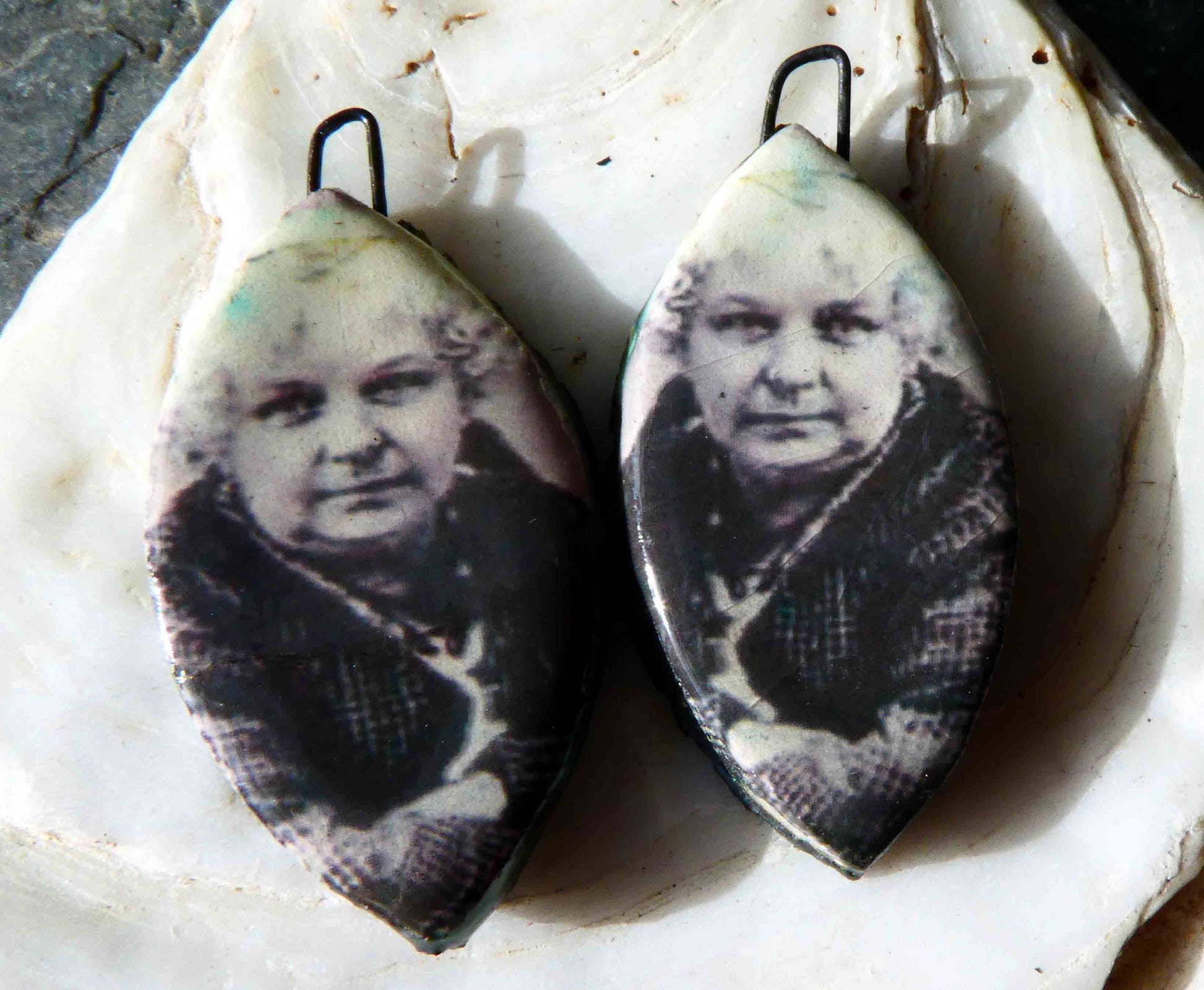 A pair of Elizabeth Cady Stanton themed decal earring charms.