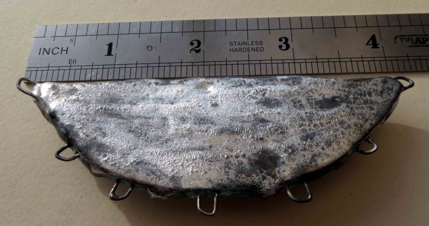 A hand formed porcelain base with mouldings. High fired. Then fired again with Bronze clay and Crackle glaze. Applied with thick layers of .999 Fine Silver, Crystal beads, and Platinum Lustre, and fired again.