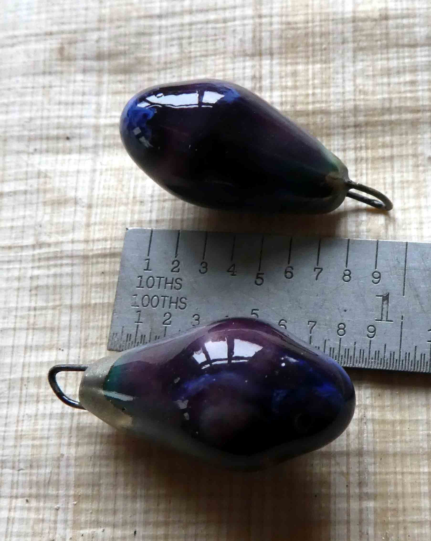 A pair of glazed droplets on hoops. Hand formed in Earthstone and fired with Royal Fantasy glaze. All slightly different, but roughly 20mms in length, plus the hoop. ©ScorchedEarthDesigns