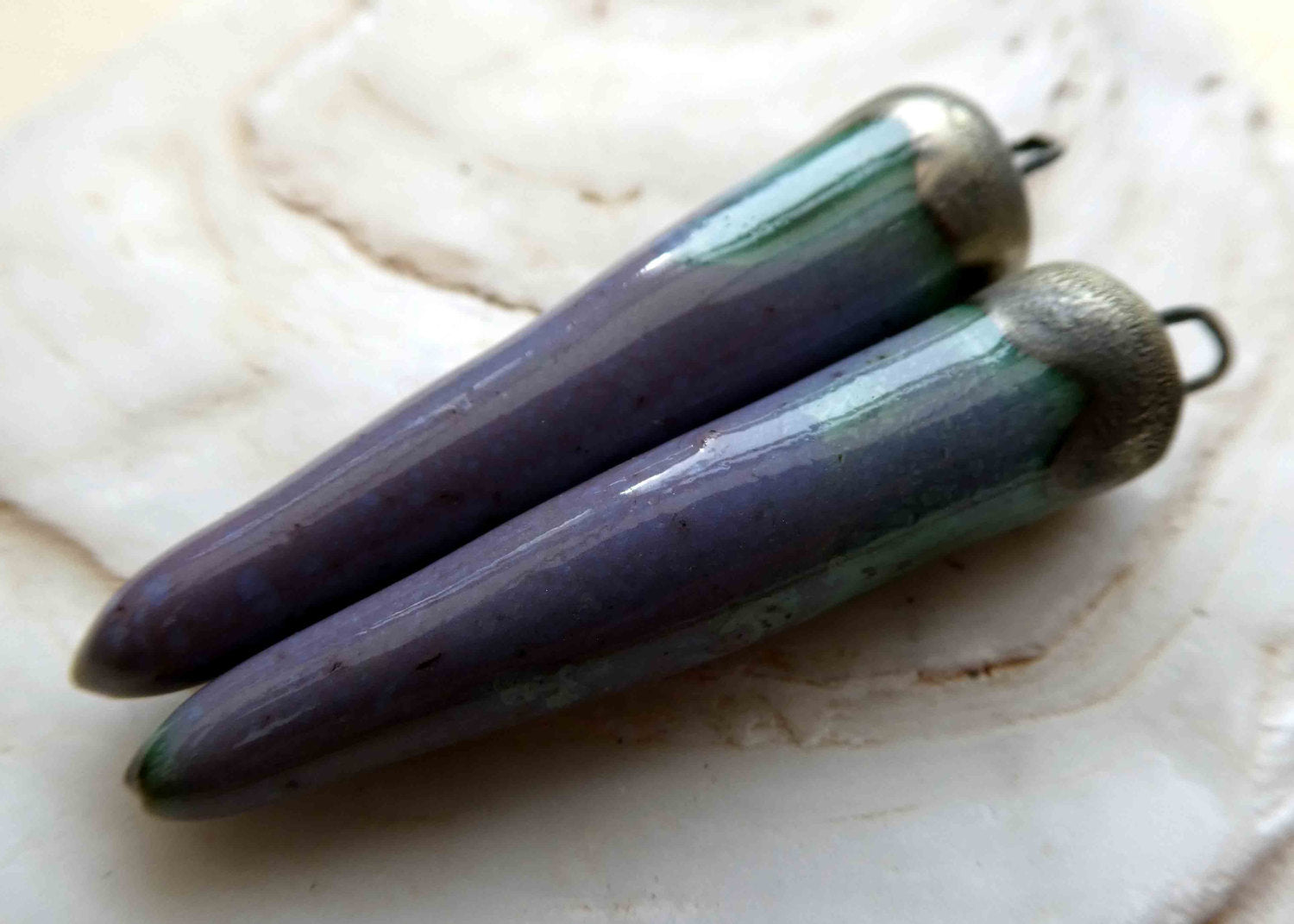 A pair of glazed spikes on hoops. Hand formed in Earthstone , and fired with Bronze clay and Glacier Fire glaze. All slightly different, but on average 35mms plus the hoop, and weigh just a gramme each.