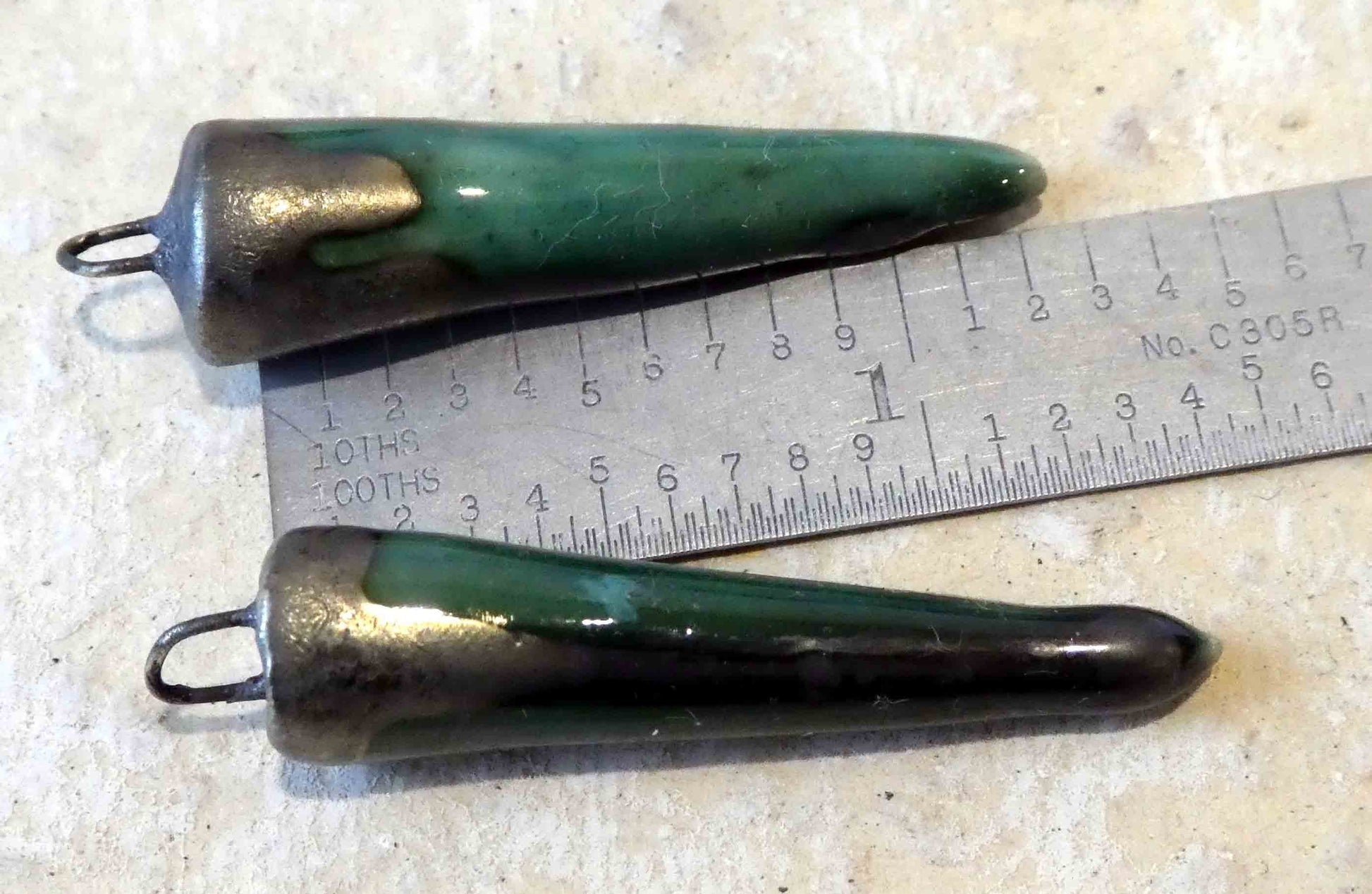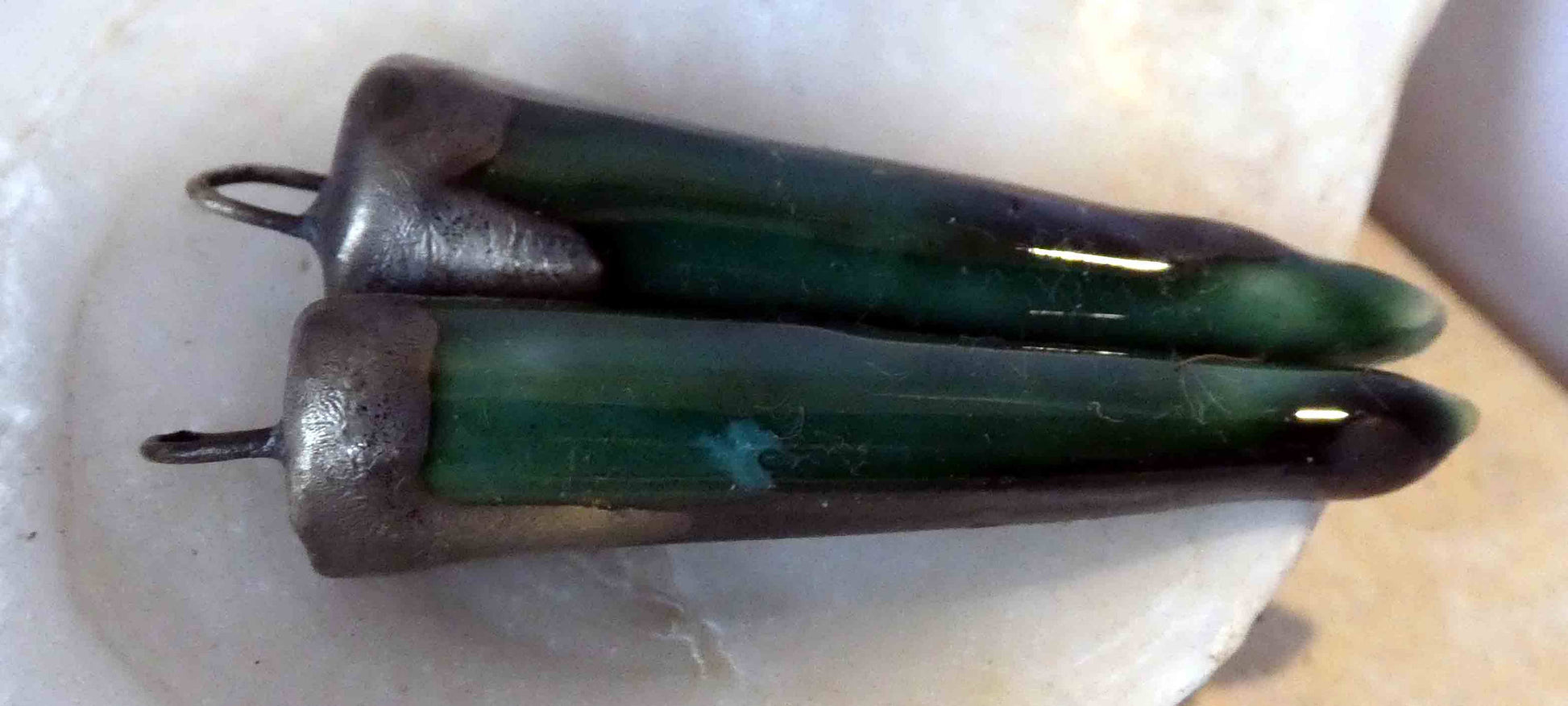 A pair of glazed, china spikes on hoops. Formed in Earthstone Glacier porcelain, and fired with Meadow Dew glaze and Bronze clay. All slightly different, but on average 35mms, plus the hoop. ©ScorchedEarthDesigns