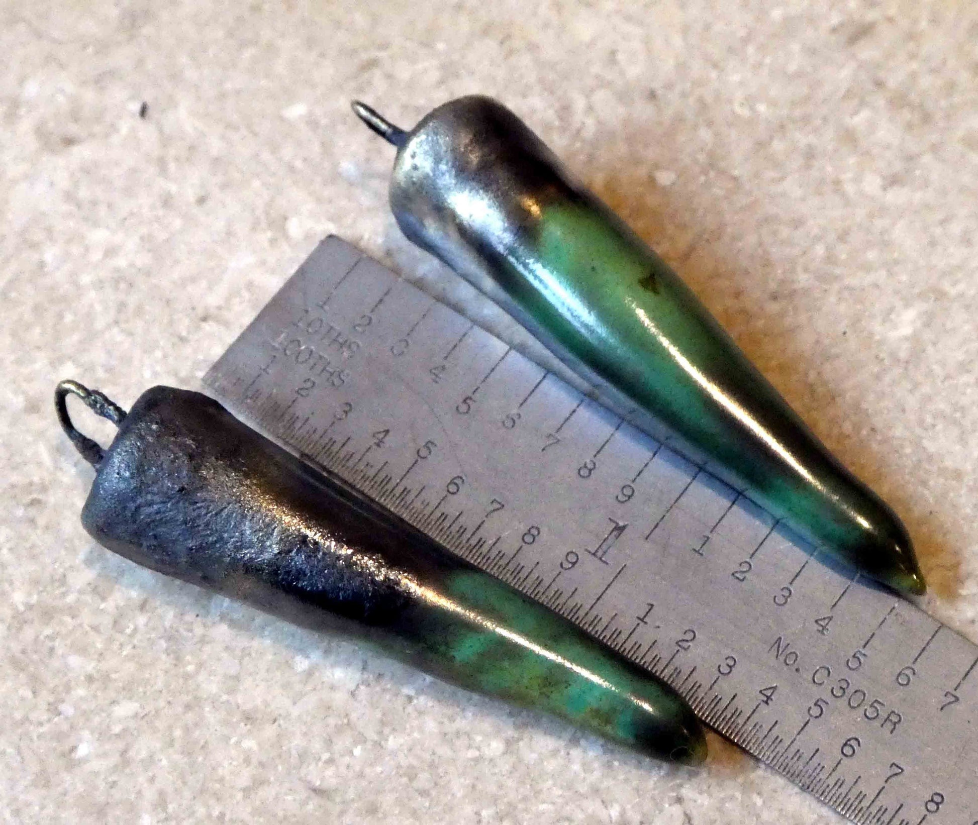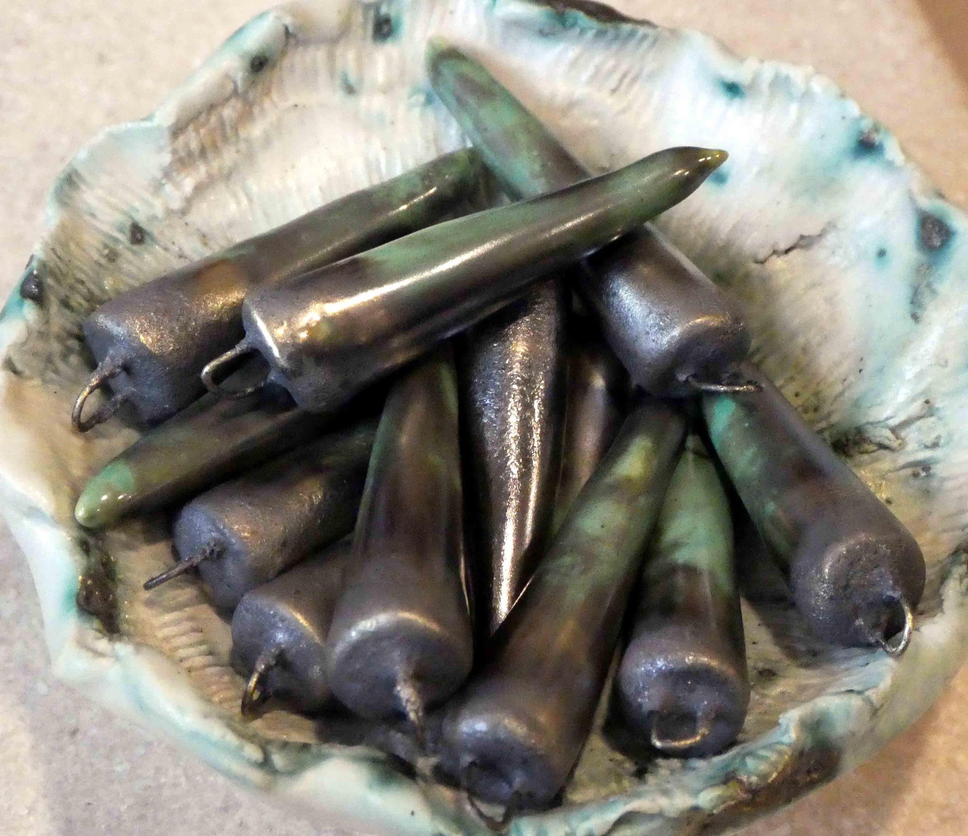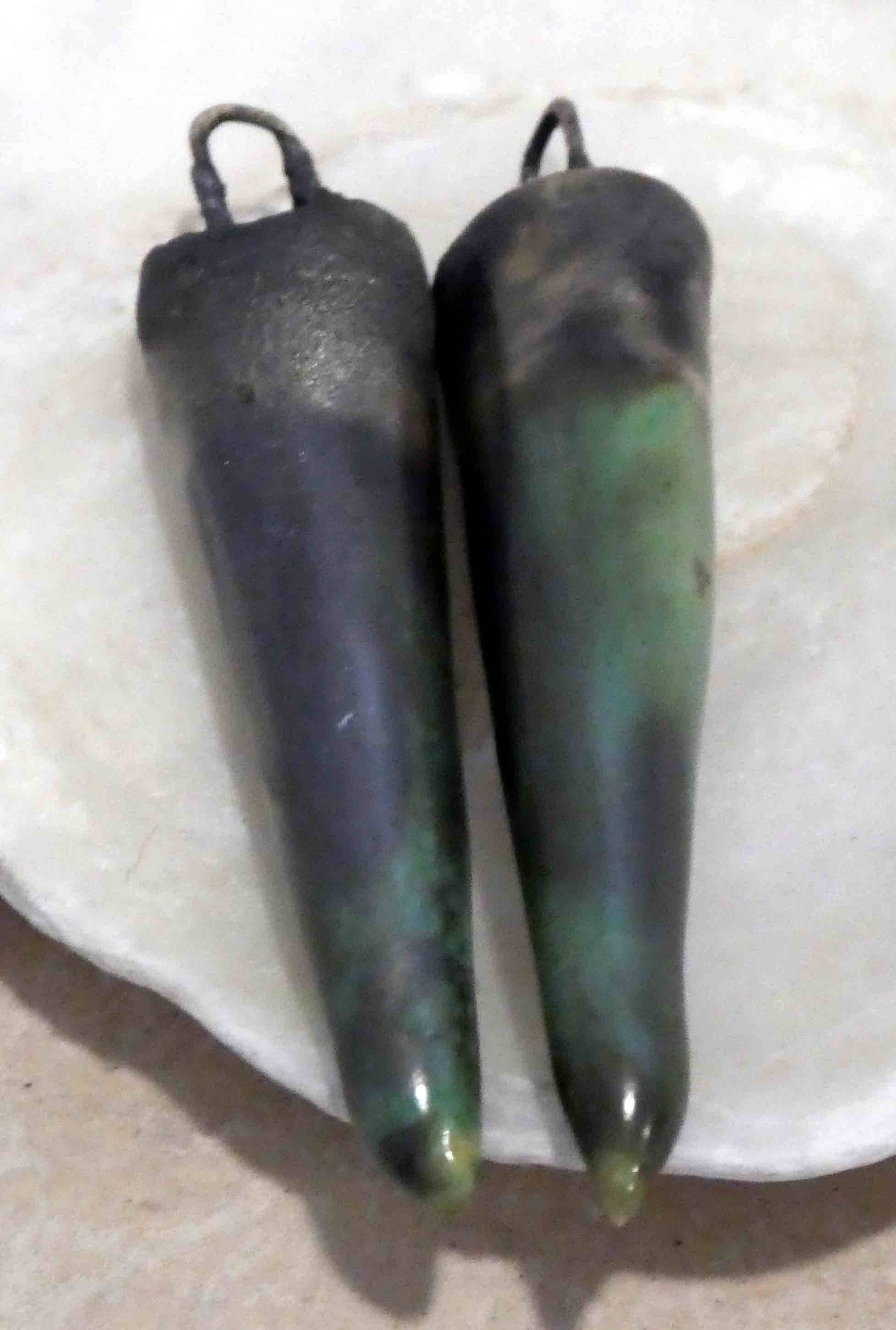 A pair of glazed spikes on hoops. Hand formed in Earthstone , and fired with Bronze clay and Supernova glaze. All slightly different, but on average 35mms plus the hoop, and weigh just a gramme each.