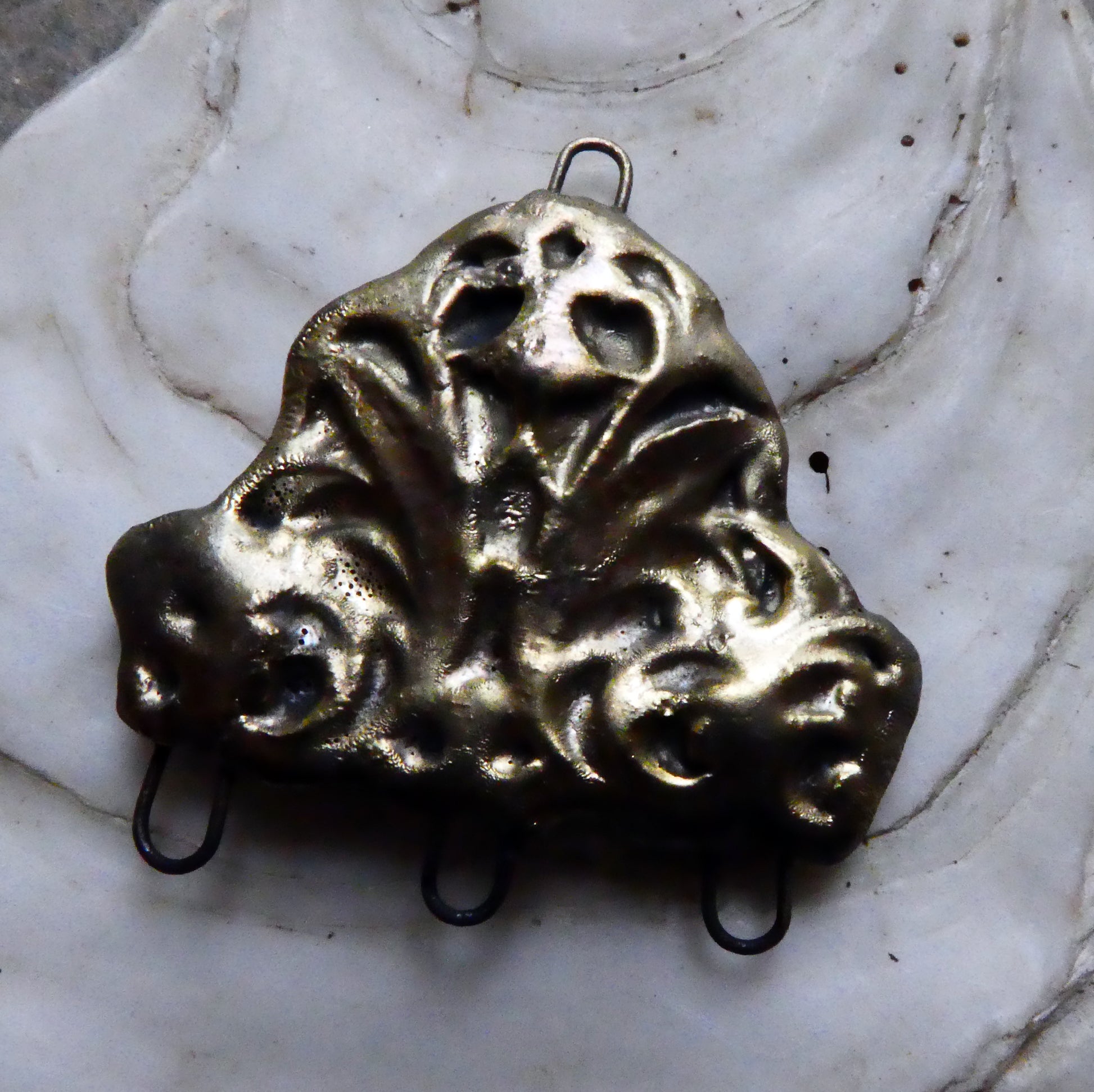 Hand formed in Earthstone and high fired. Fired again with bronze clay. With three hoops for connections.