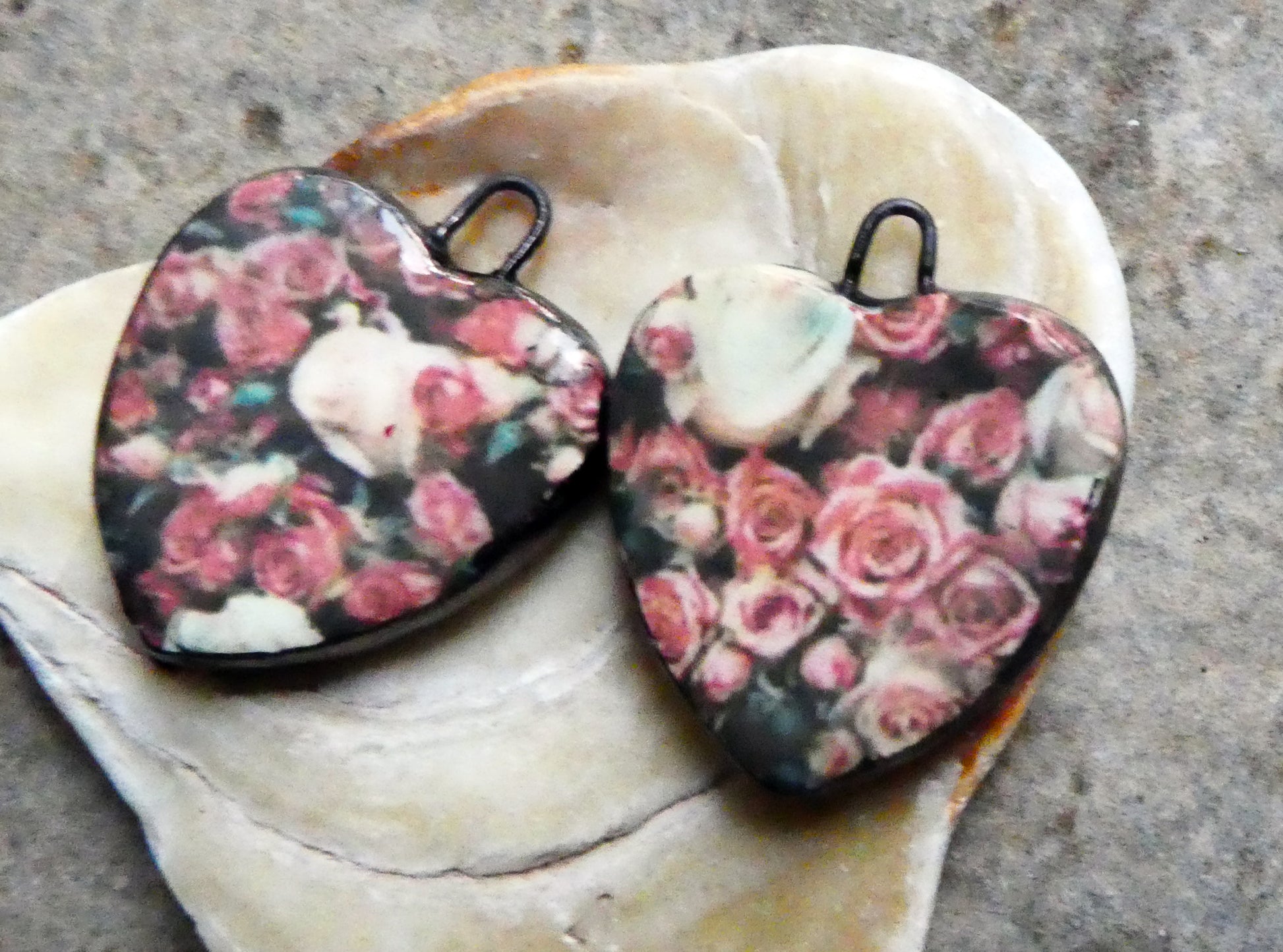 Hand formed in Earthstone and high fired. Then fired again with bronze clay and gloss glaze. Applied with decals and fired again. Scorched on the backs to a rainbow finish.