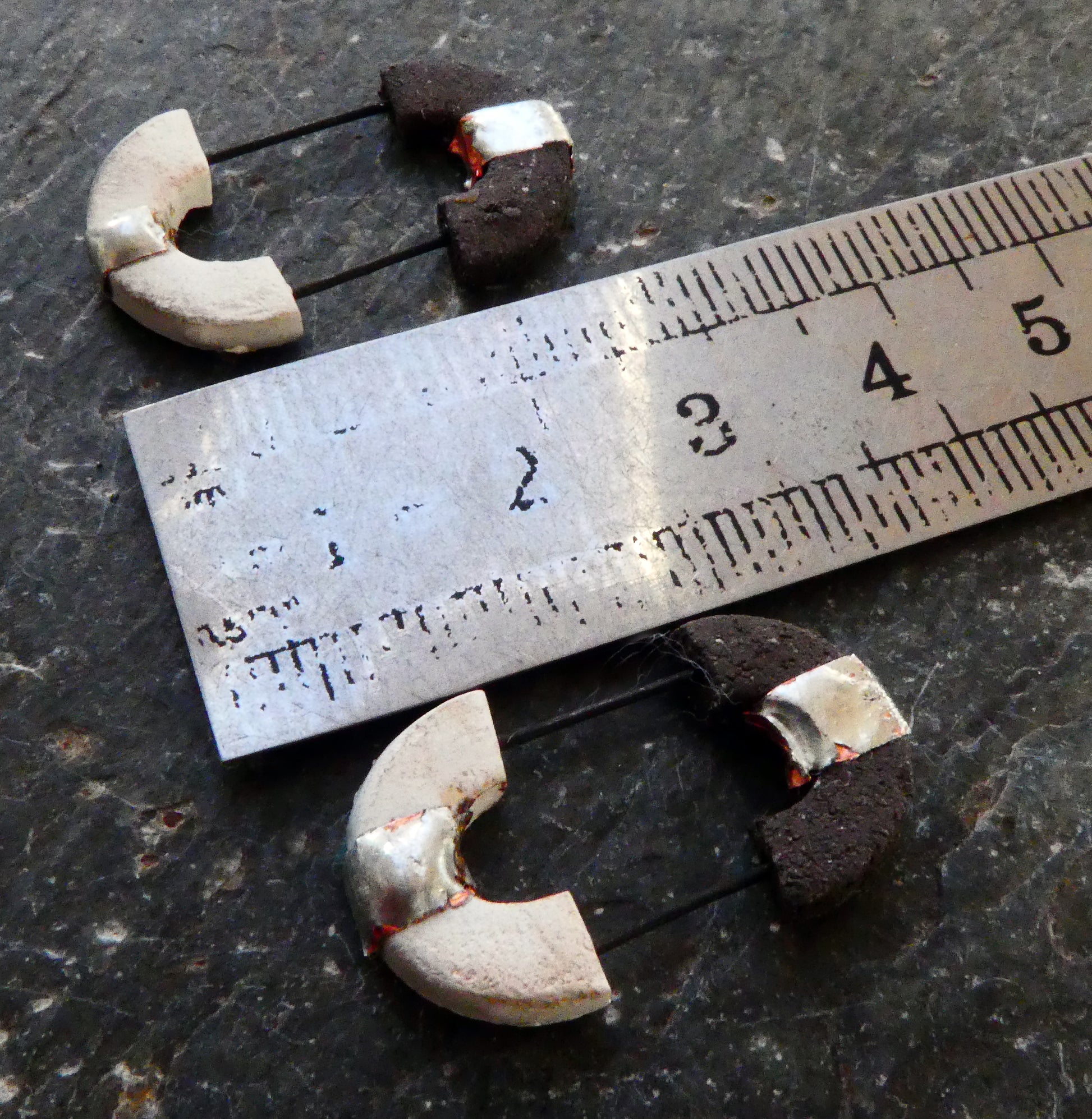 Hand formed in smooth black stoneware and Porcelain, and high fired. With added accents in lead-free, jewellery grade solder.