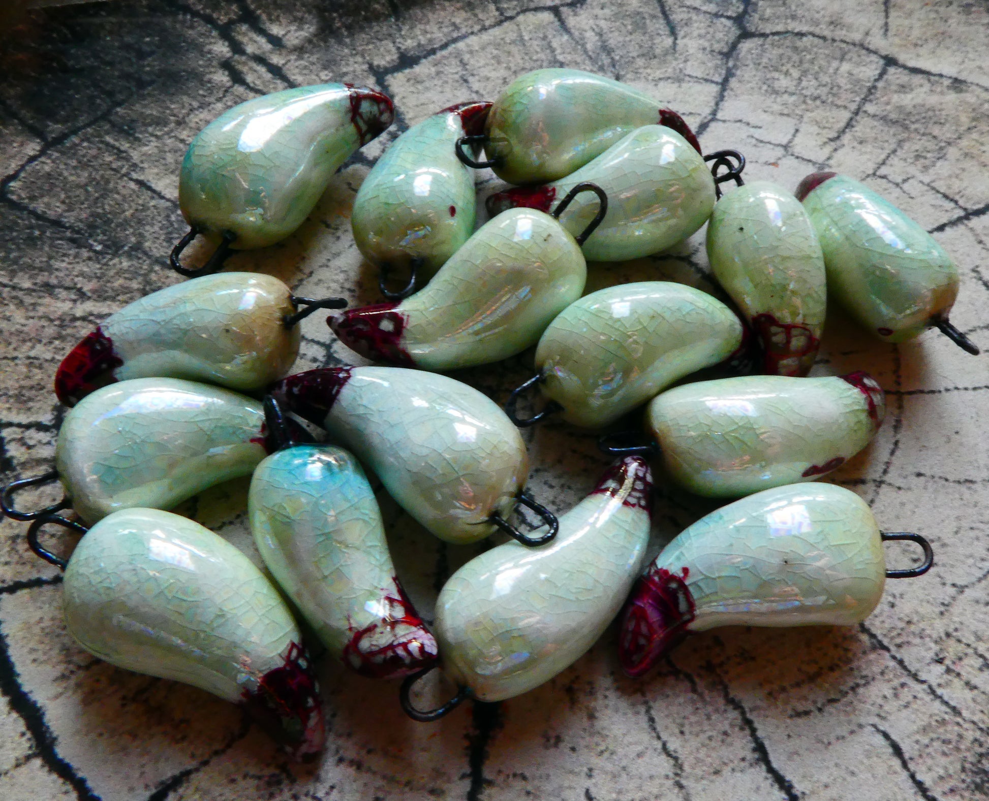 Hand formed in Porcelain, and high fired. Applied with Crackle glaze and fired again. Applied with Mother of Pearl and Red lustres, and fired once more.