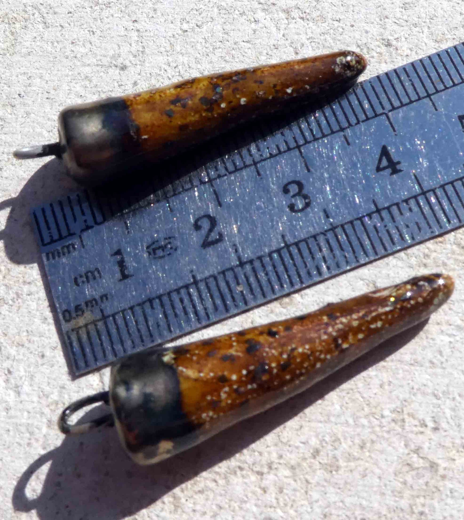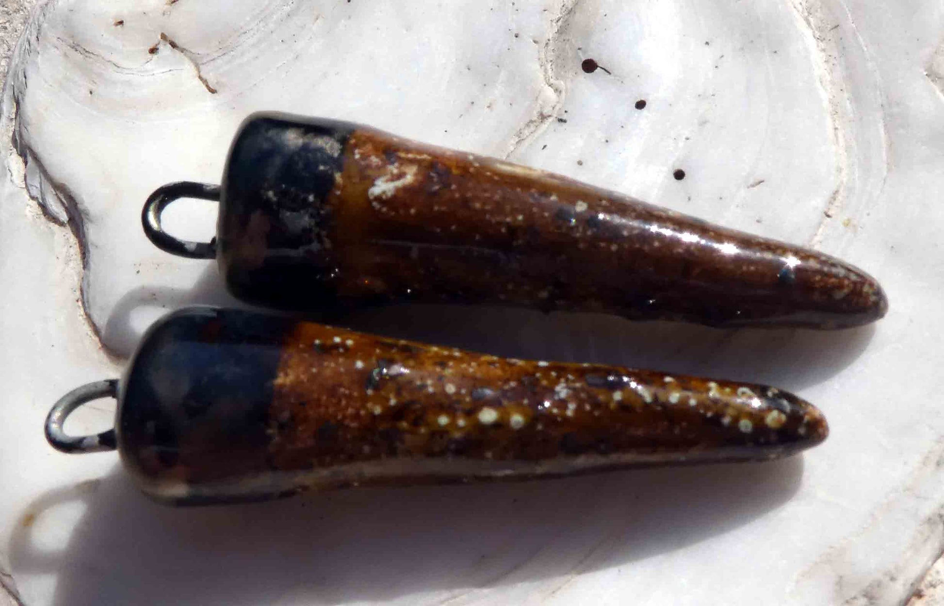 A pair of glazed spikes on hoops. Hand formed in Earthstone, and fired with Bronze clay and ???? glaze. This is one of a few very temperamental glazes I have, and after it's initial firing, the result was patchy and lumpy. So, I fired them again with white glimmer and Cognac glaze, and I'm rather pleased with the finish......