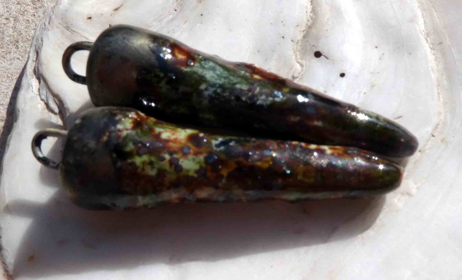 A pair of glazed spikes on hoops. Hand formed in Earthstone, and fired with Bronze clay and ???? glaze. This is one of a few very temperamental glazes I have, and after it's initial firing, the result was patchy and lumpy. So, I fired them again with white glimmer and Dune glaze, and I'm rather pleased with the finish......