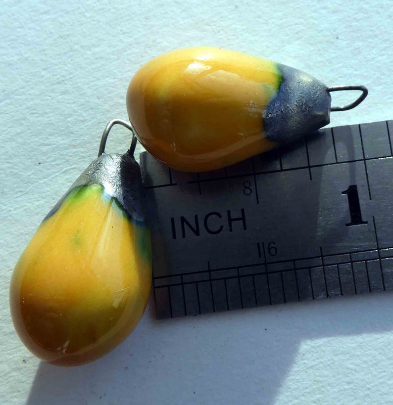 A pair of glazed drops on hoops. Formed in Earthstone , and fired with Deep Yellow glaze and Bronze clay. All slightly different, but on average 20mms, plus the hoop.