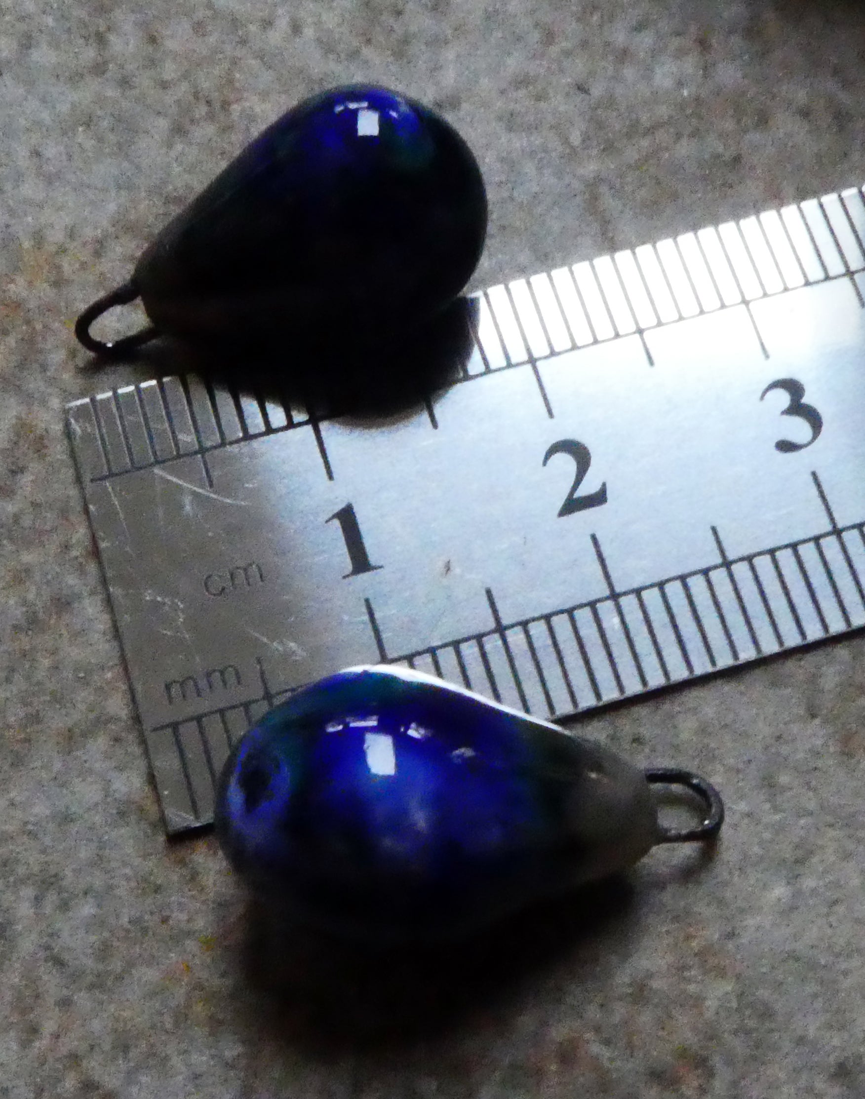 A pair of glazed drops on hoops. Hand formed in Earthstone, and fired with Bronze clay and Monets Garden glaze. All slightly different, but on average are 20mms plus the hoop. ©ScorchedEarthDesigns