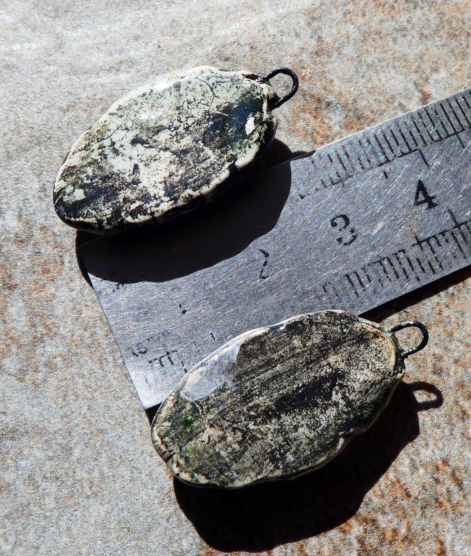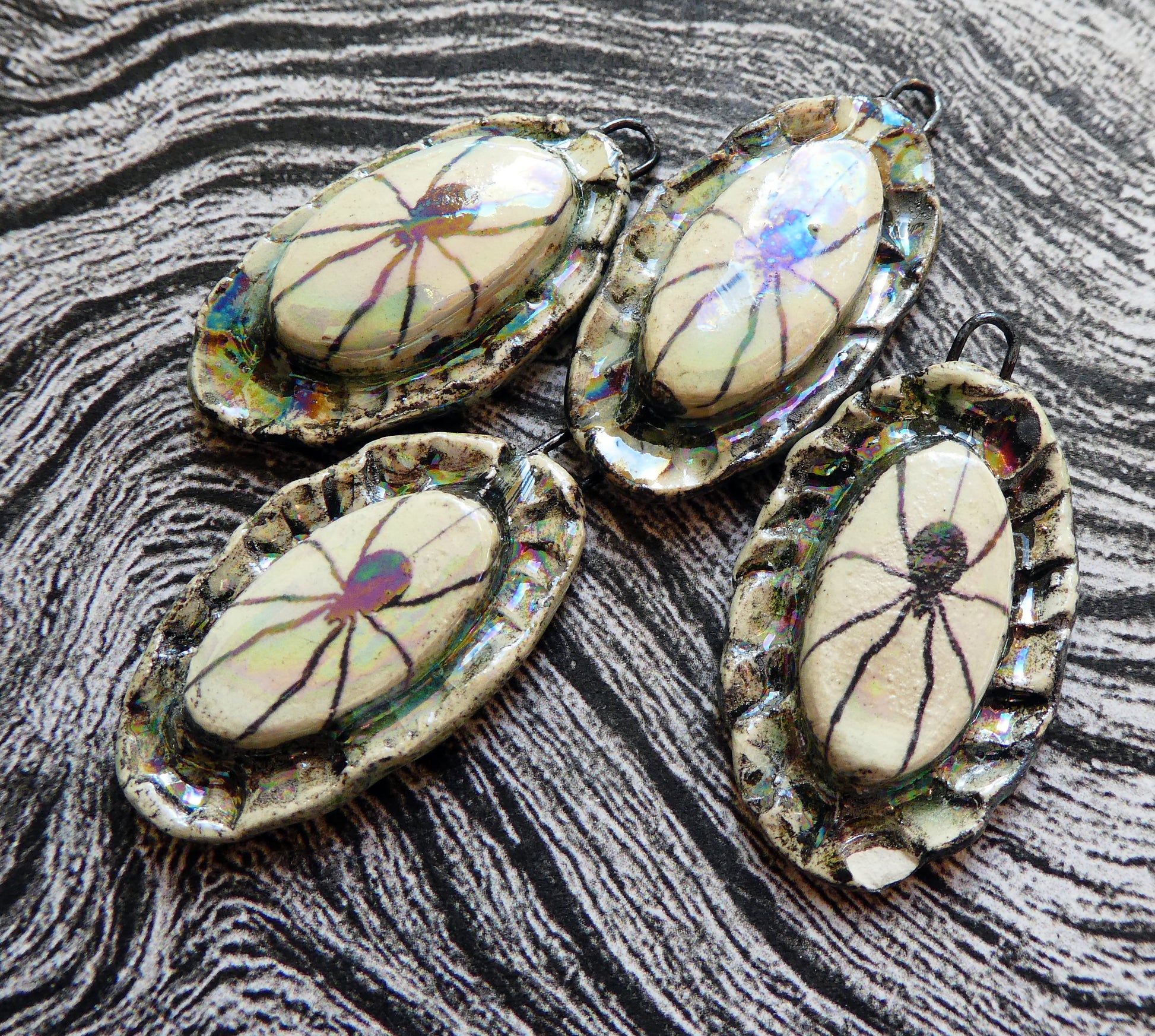 Hand formed in Earthstone and high fired. Then fired oxide, and again with Gloss glaze. Applied with spider decals and fired again, and then a fifth time with Mother of Pearl lustre.