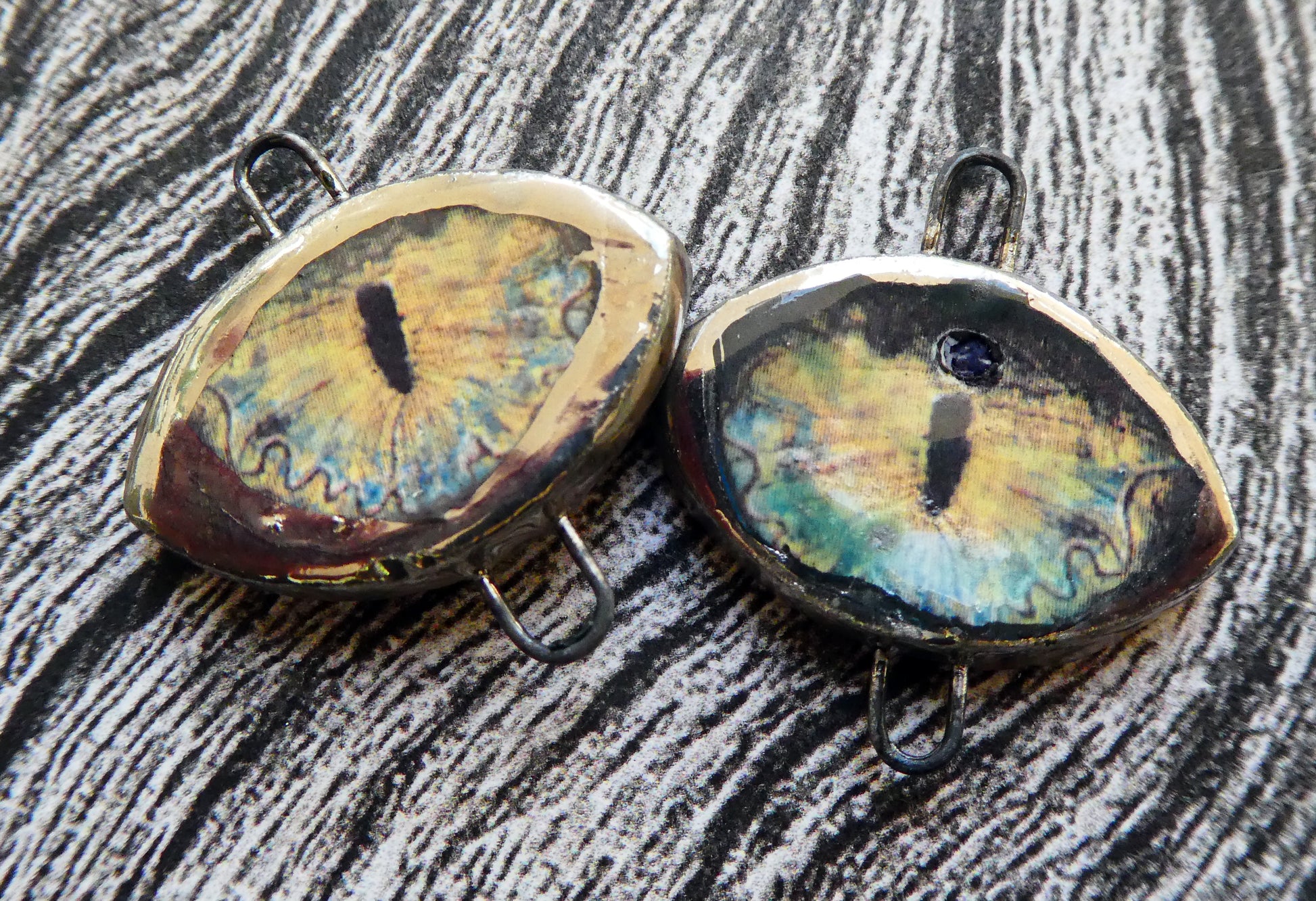Hand formed, super slim droppers with a connection hoop on the bottoms, fired with gloss glaze and Bronze clay. Then applied with cats eyes decals and fired again with Lustre. Scorched to an irridescent finish on the backs.