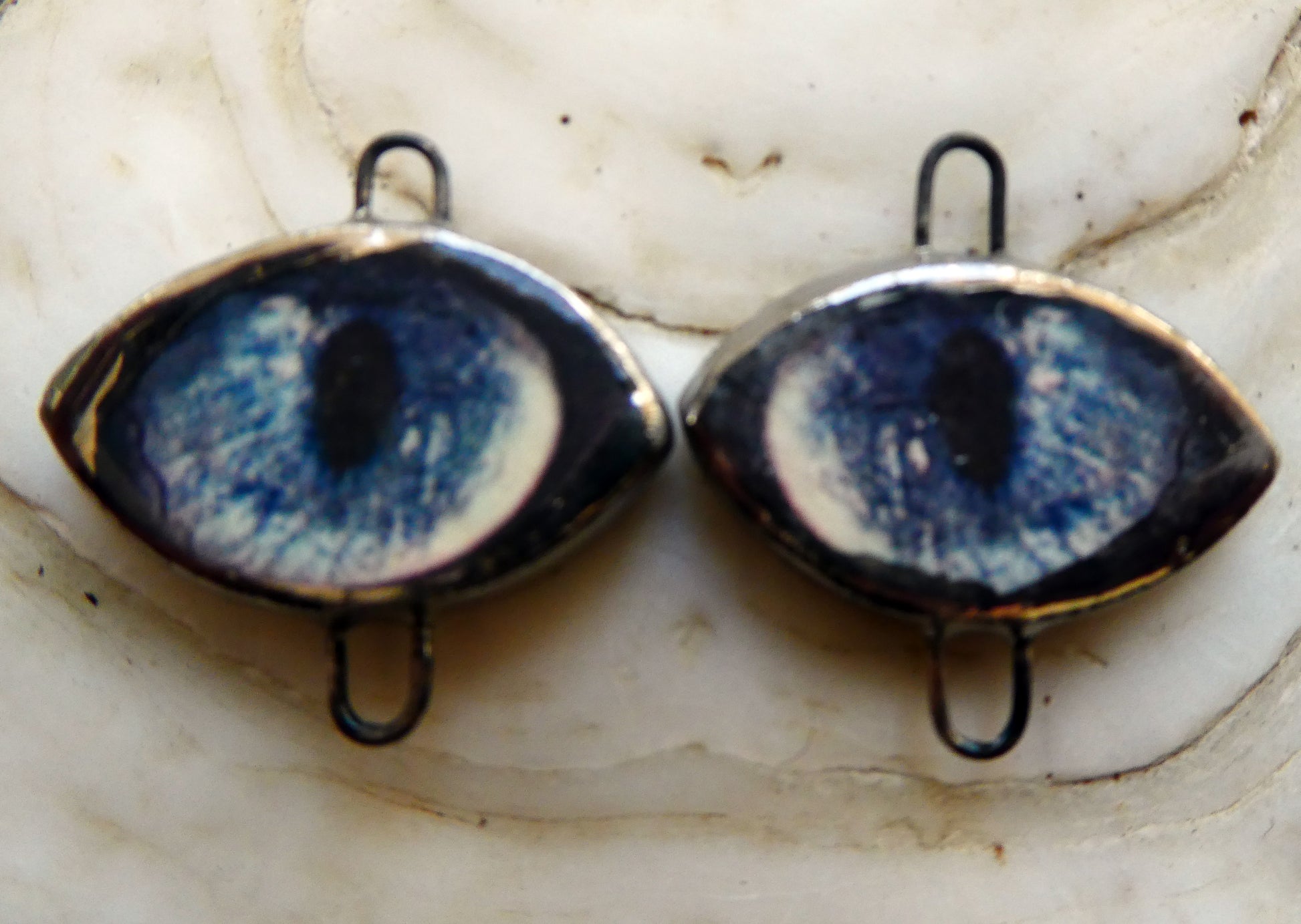 Hand formed, super slim droppers with a connection hoop on the bottoms, fired with gloss glaze and Bronze clay. Then applied with cats eyes decals and fired again with Lustre. Scorched to an irridescent finish on the backs.