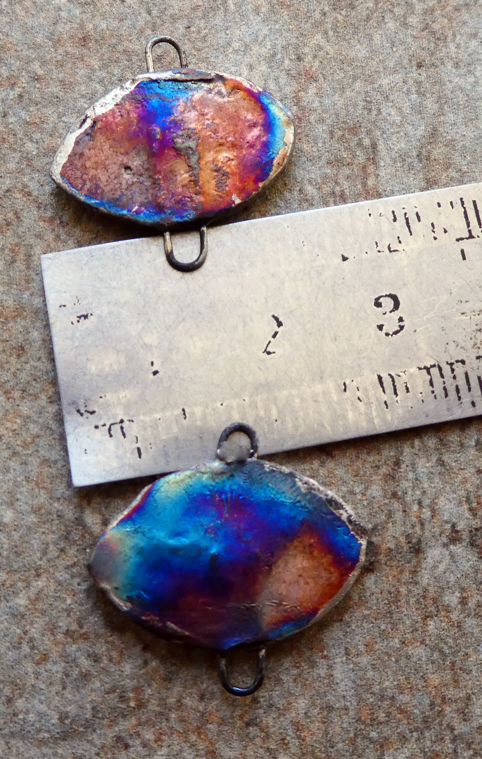 Hand formed, super slim droppers with a connection hoop on the bottoms, fired with gloss glaze and Bronze clay. Then applied with cats eyes decals and fired again with Lustre. Scorched to an irridescent finish on the backs.