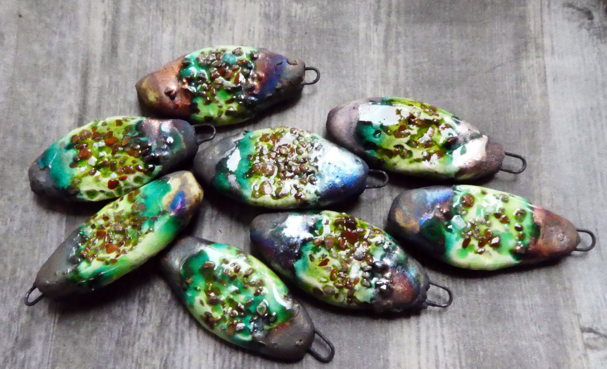 Hand formed in Earthstone, fired with embedded coarse sand that I collected from Lynmouth beach. Then fired again with Lime glaze and bronze clay. Scorched on the tops and bottoms to a coppery finish.
