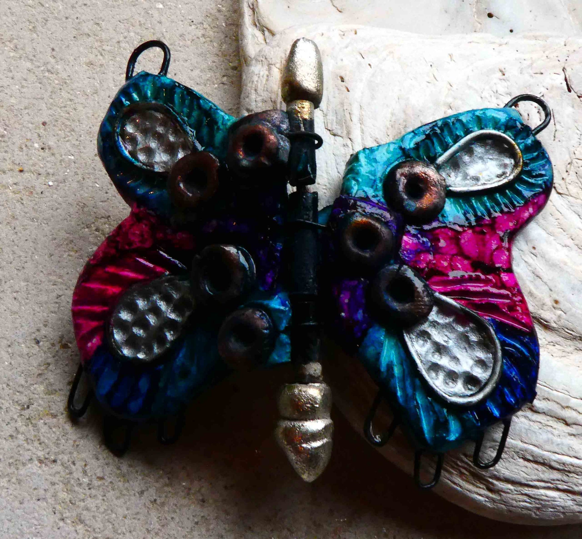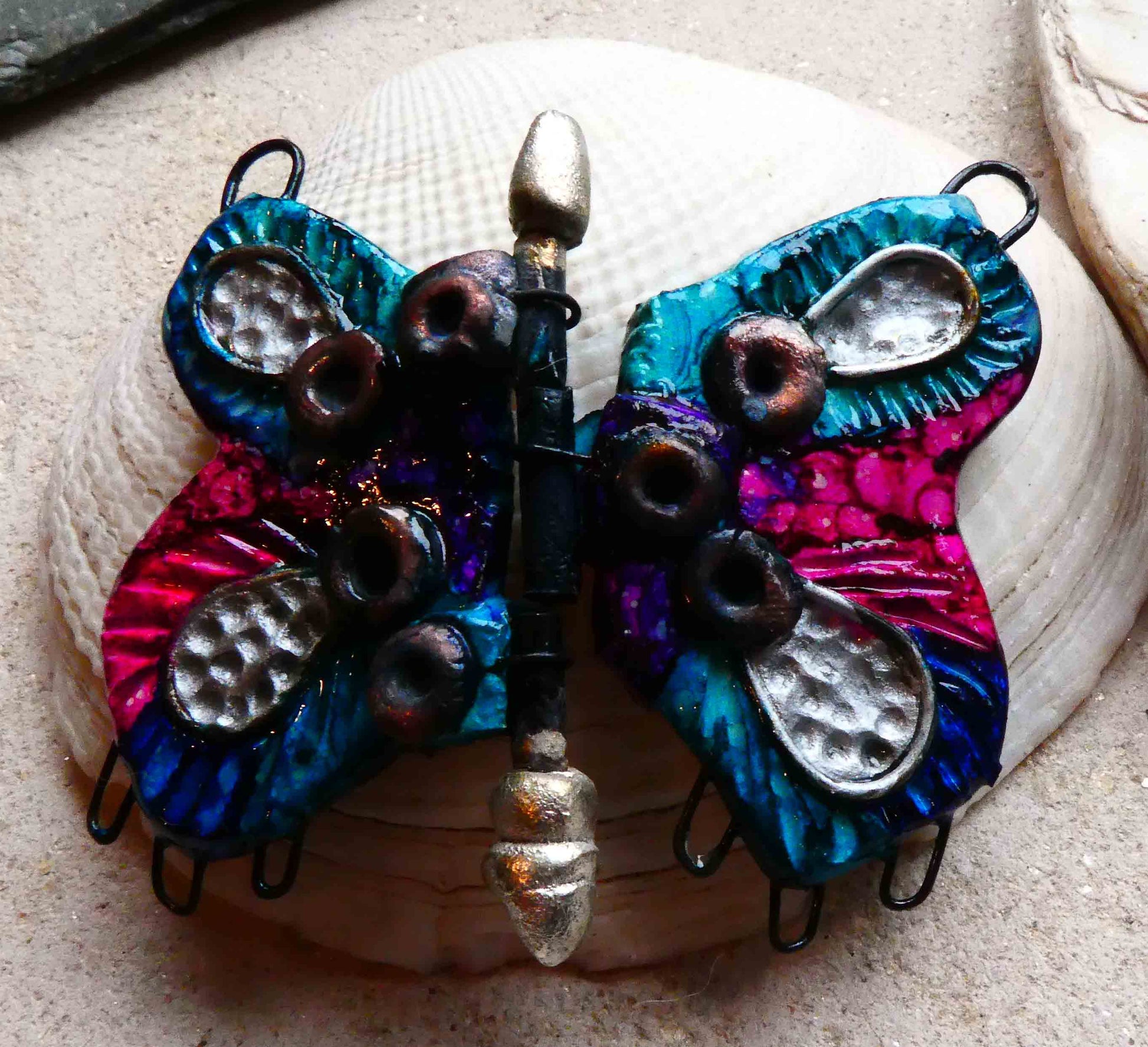 Hand formed in Earthstone, textured and joined together with a freely moving hinge. High fired. Then fired again with gloss glaze and bronze clay. Fired again with Sterling Silver clay. Scorched on the mouldings and the back. With layers of alcohol inks and lacquer. With six hoops on the bottom for connections.