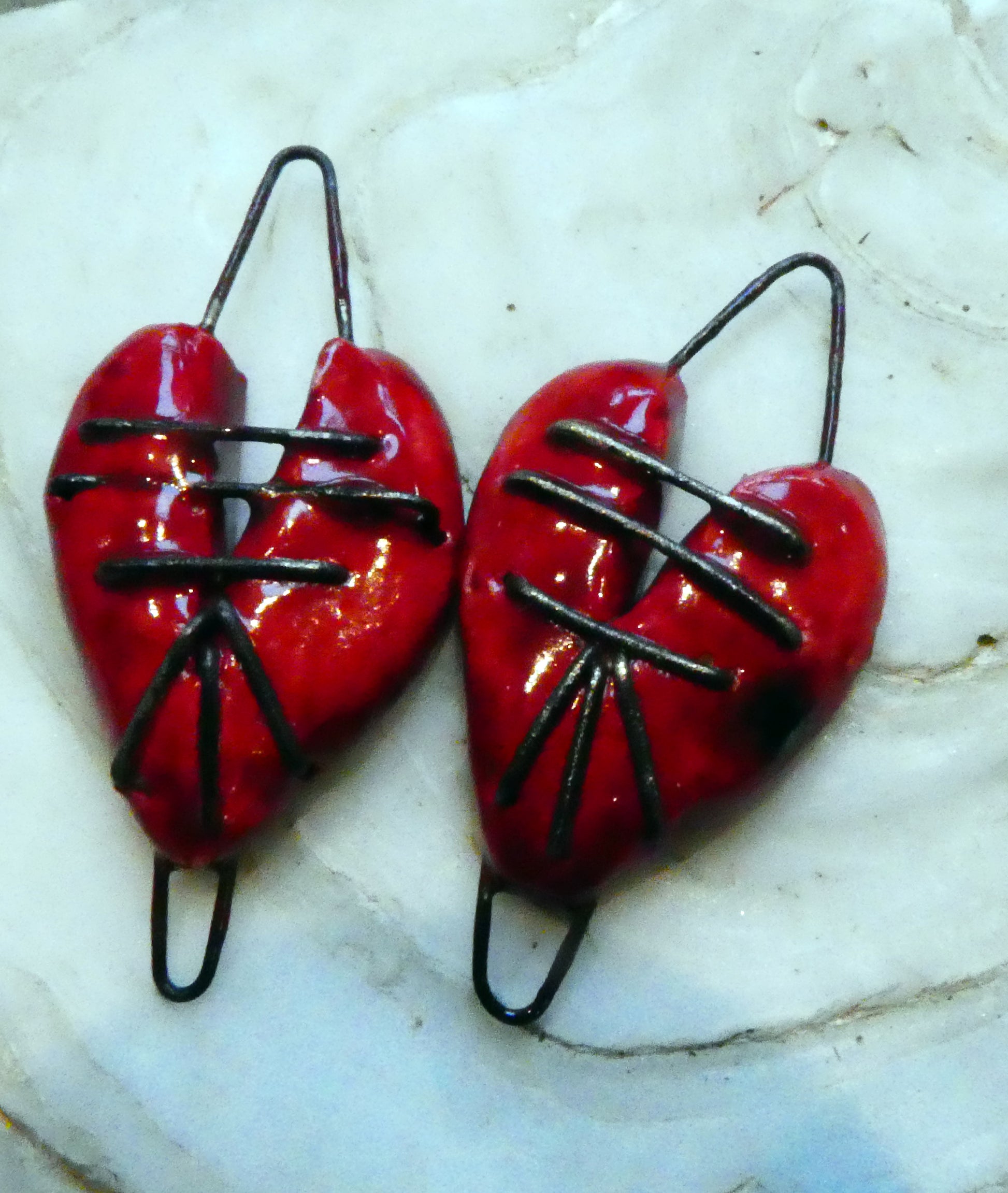 Hand formed in Earthstone and high fired with embedded staples. Then fired again with Bronze clay and Red glaze.