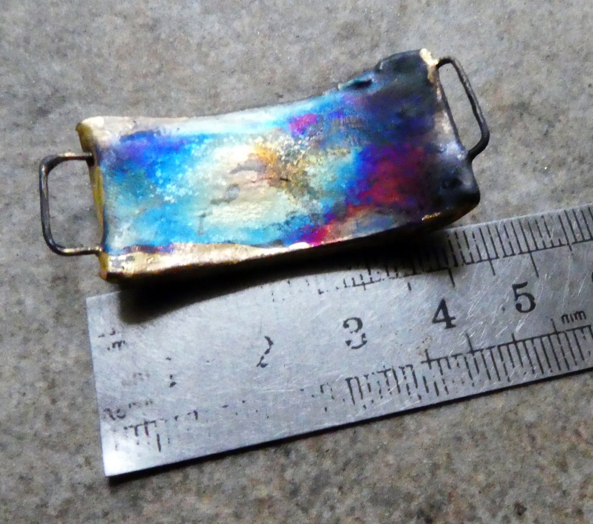 High fired, then fired again with gloss glaze and Bronze clay. Applied with a skeleton decal and fired again with lustre. Curved to fit a wrist. The decal has split a bit on one side, hence the lower price.