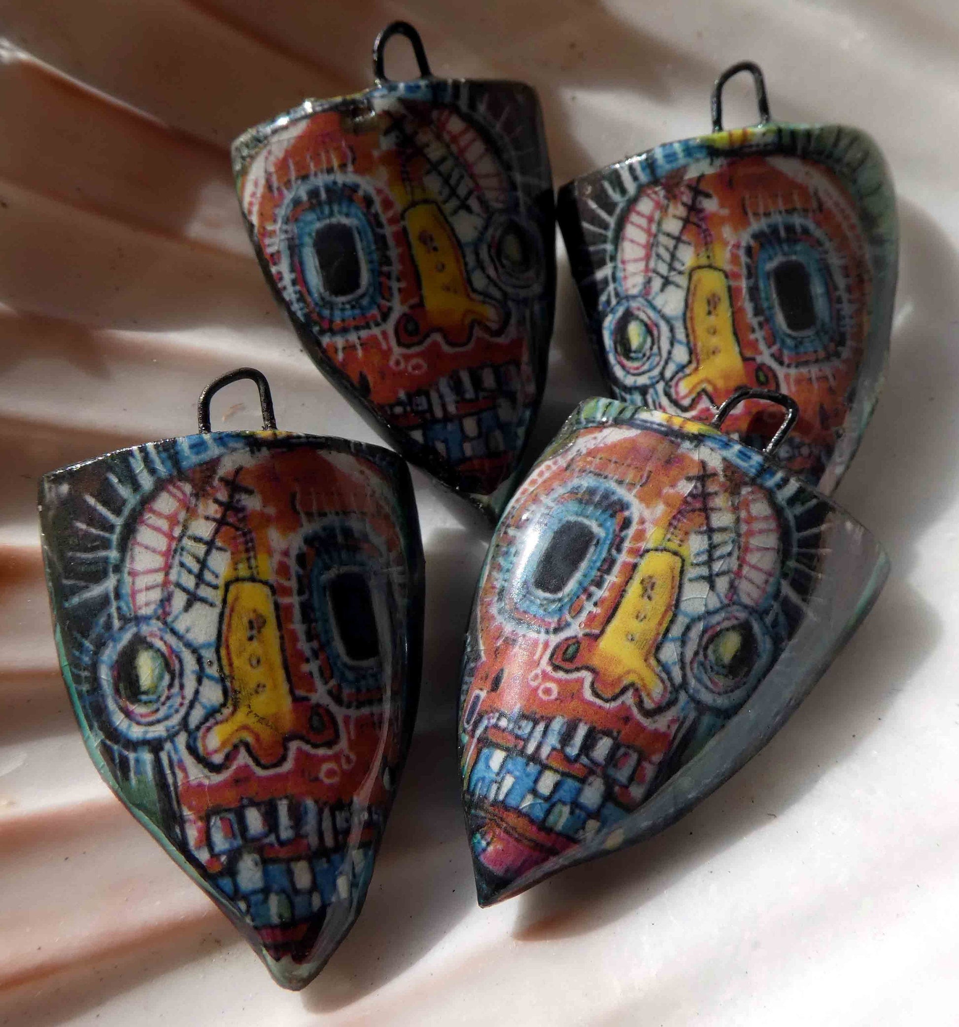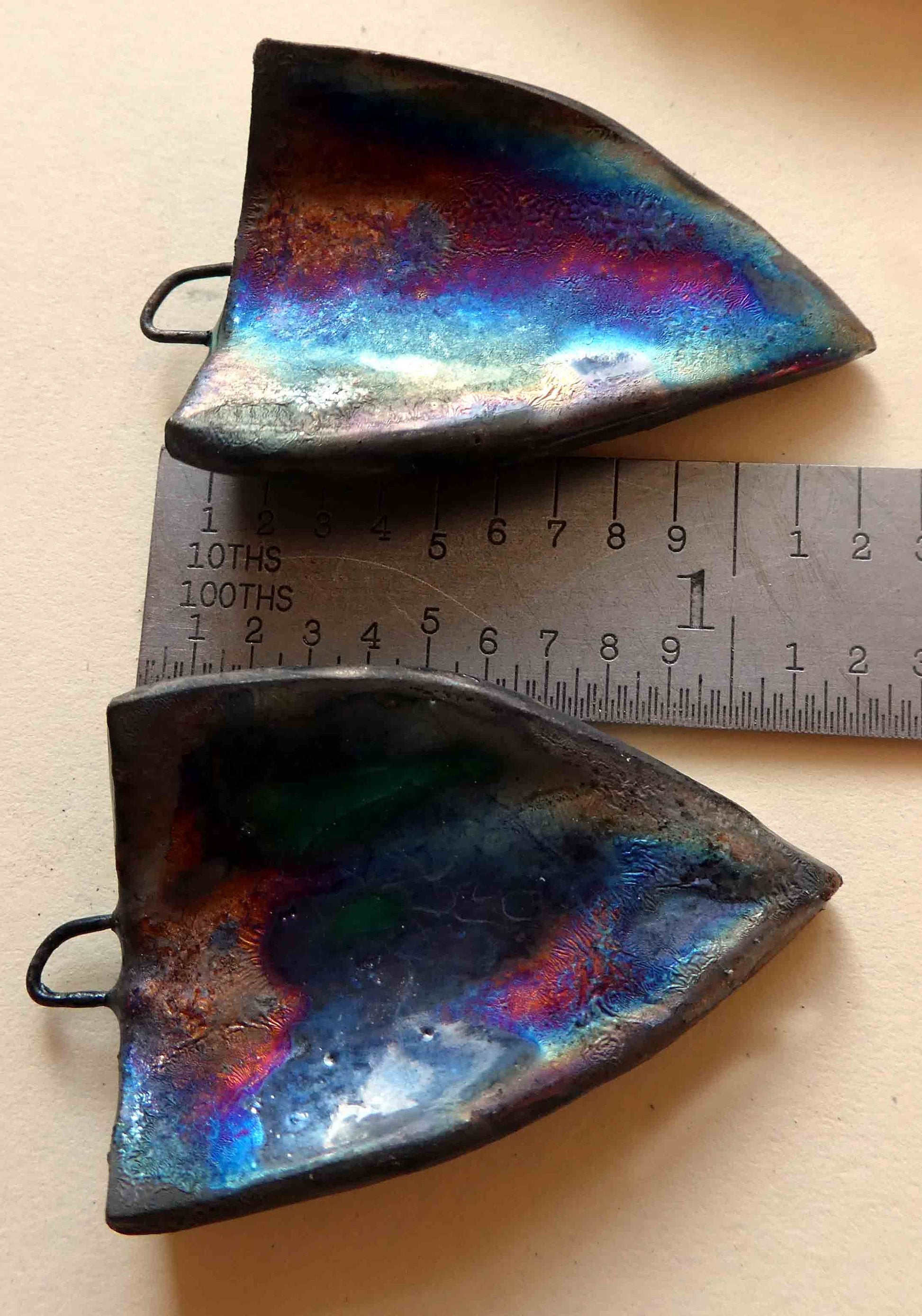 A pair of lightweight droppers. Hand formed shield shaped droppers, fired with gloss glaze and Bronze clay. Then applied with Jean-Michel Basquiat decals and fired again with Lustre. Scorched on the backs to a rainbow finish. 30mms, and very lightweight. ©ScorchedEarthDesigns