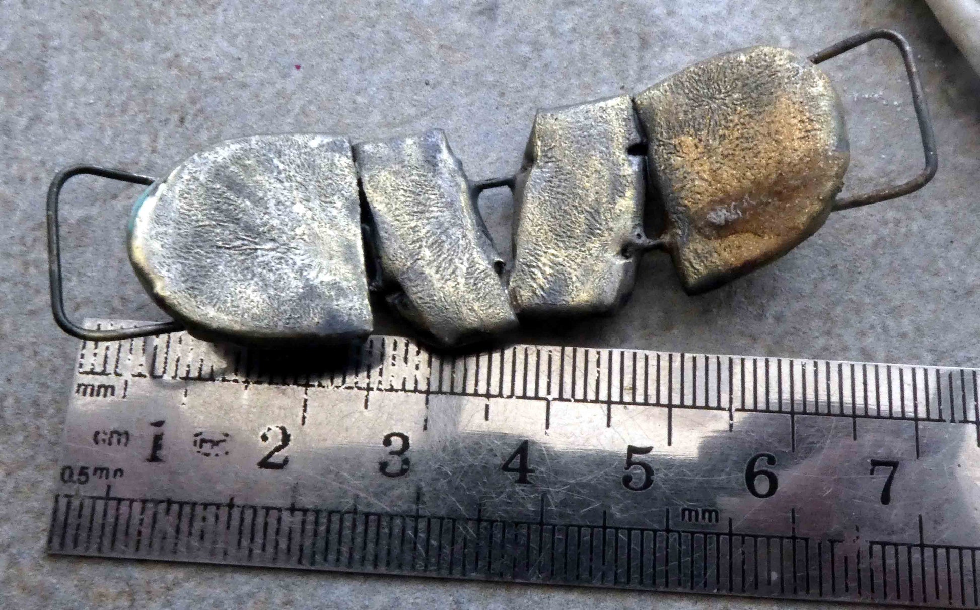 Hand formed in Porcelain and high fired. Then fired again with bronze clay and gloss glaze. Applied with Platinum and Gold Lustre, and fired again. Curved to fit a wrist.