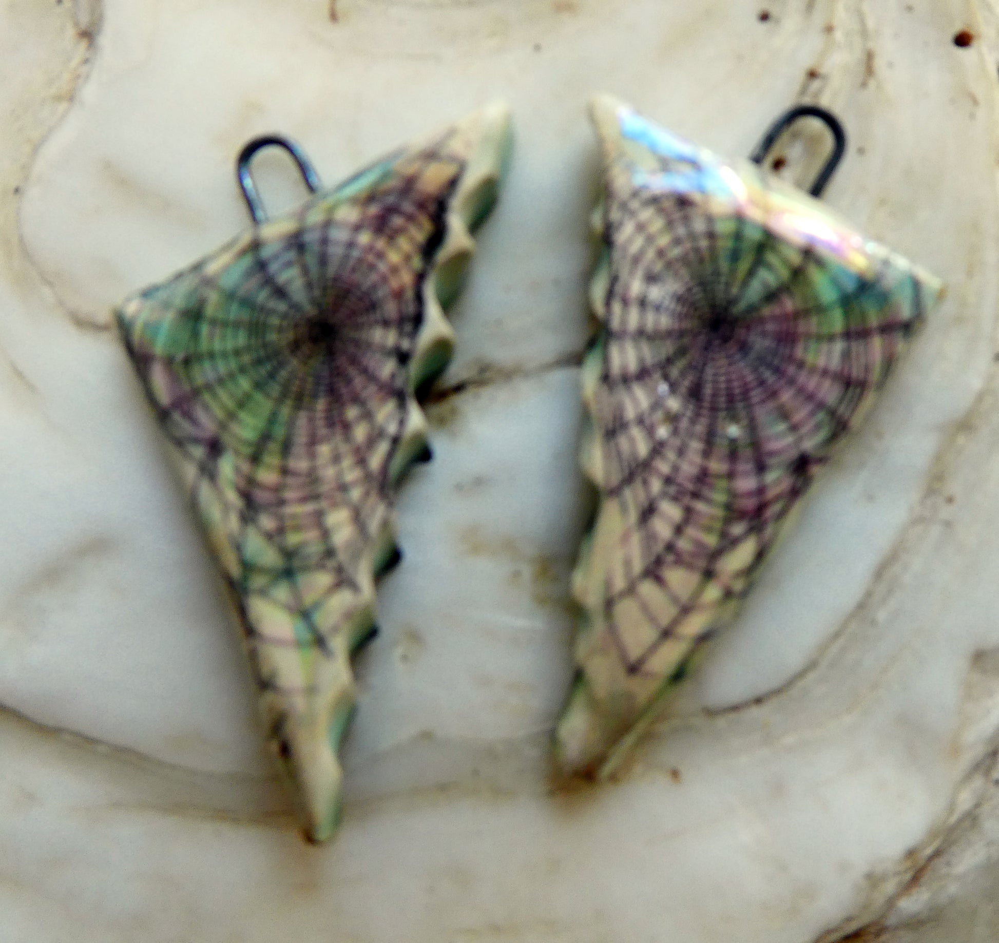 Hand formedin Earthstone, and high fired. Fired again with gloss glaze and Bronze clay. Then applied with cobweb decals and fired again.Applied with mother of pearl lustre, and fired once more. Scorched to an irridescent finish on the backs.