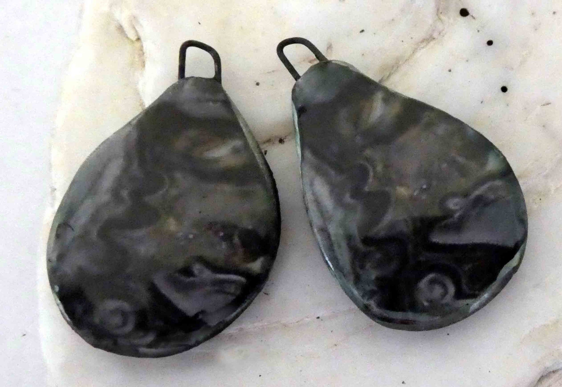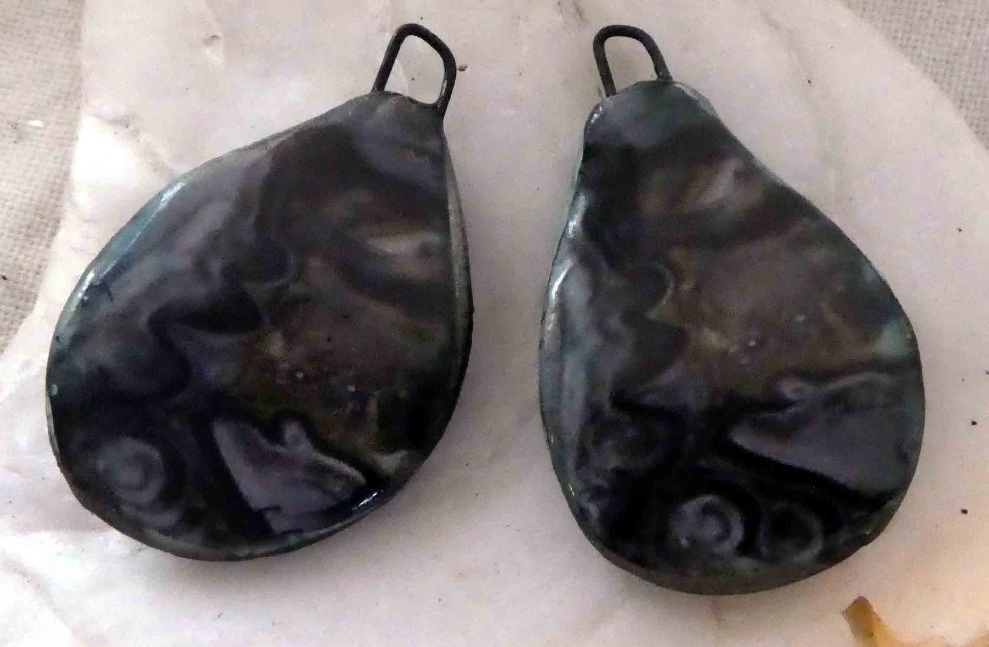 A pair of lightweight droppers. Hand formed, super slim droppers, fired with gloss glaze and Bronze clay. Then applied with Gemstone decals and fired again with Lustre. Scorched to a rainbow finish on the backs. 30mms, and very lightweight. ©ScorchedEarthDesigns