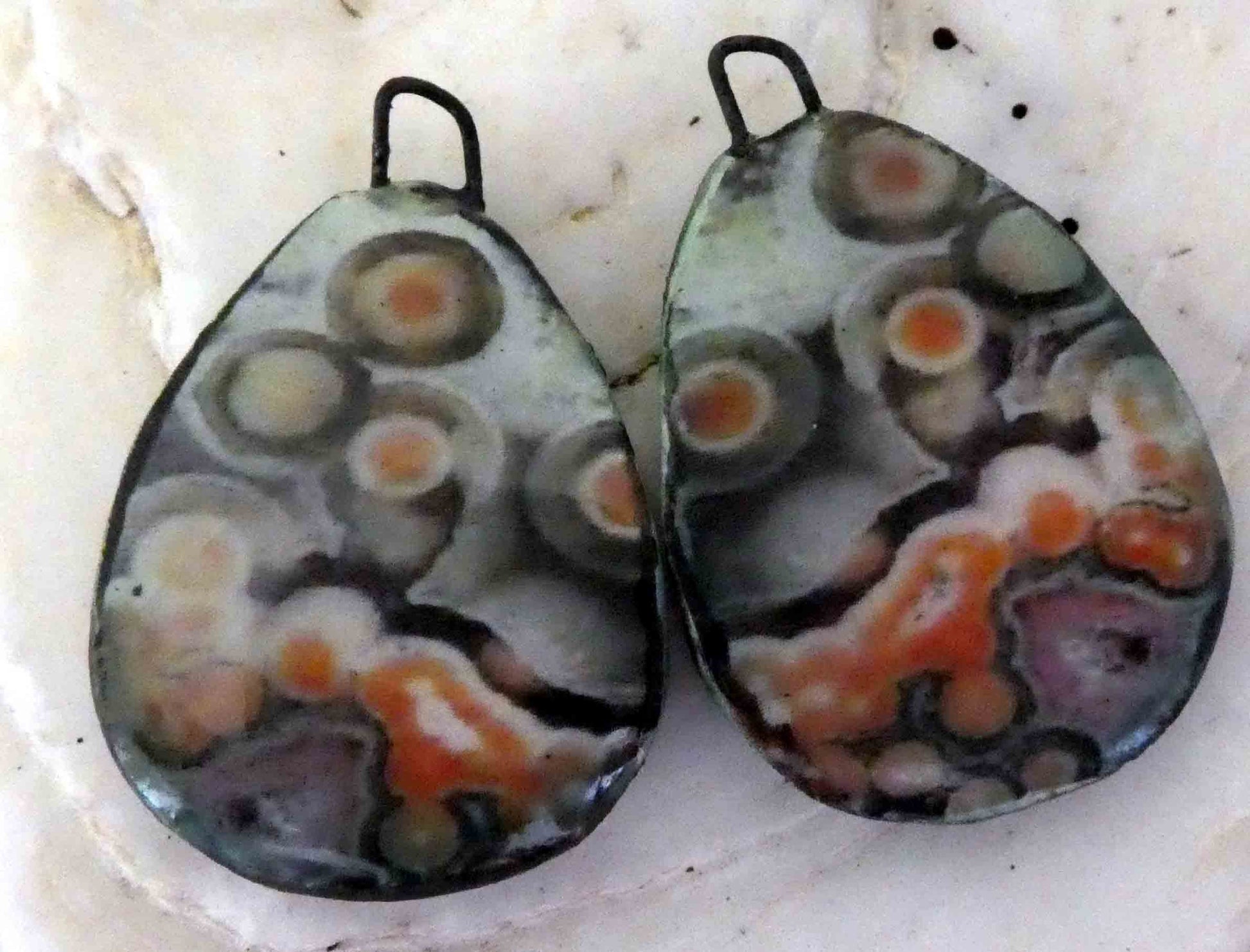 A pair of lightweight droppers. Hand formed, super slim droppers, fired with gloss glaze and Bronze clay. Then applied with Gemstone decals and fired again with Lustre. Scorched to a rainbow finish on the backs. 30mms, and very lightweight. ©ScorchedEarthDesigns