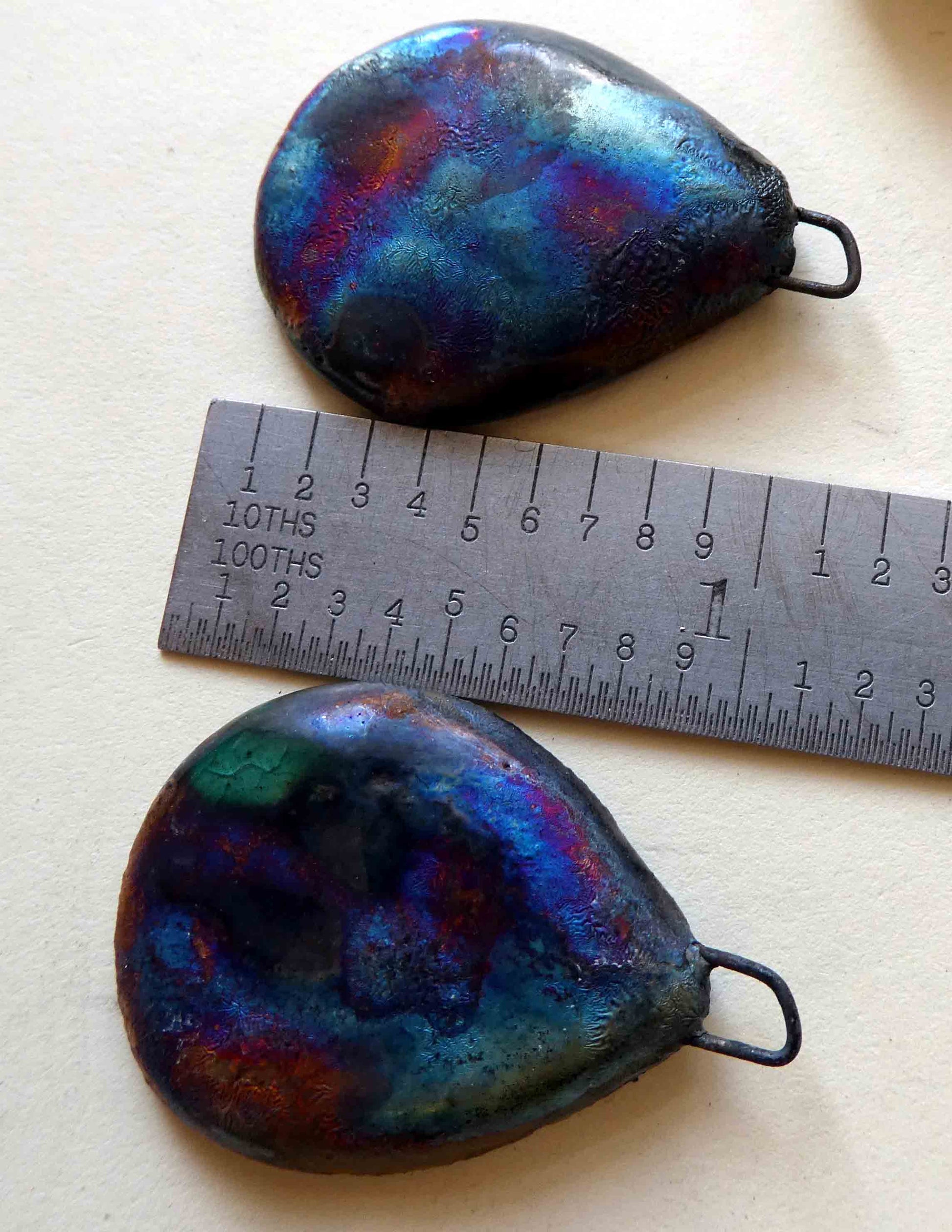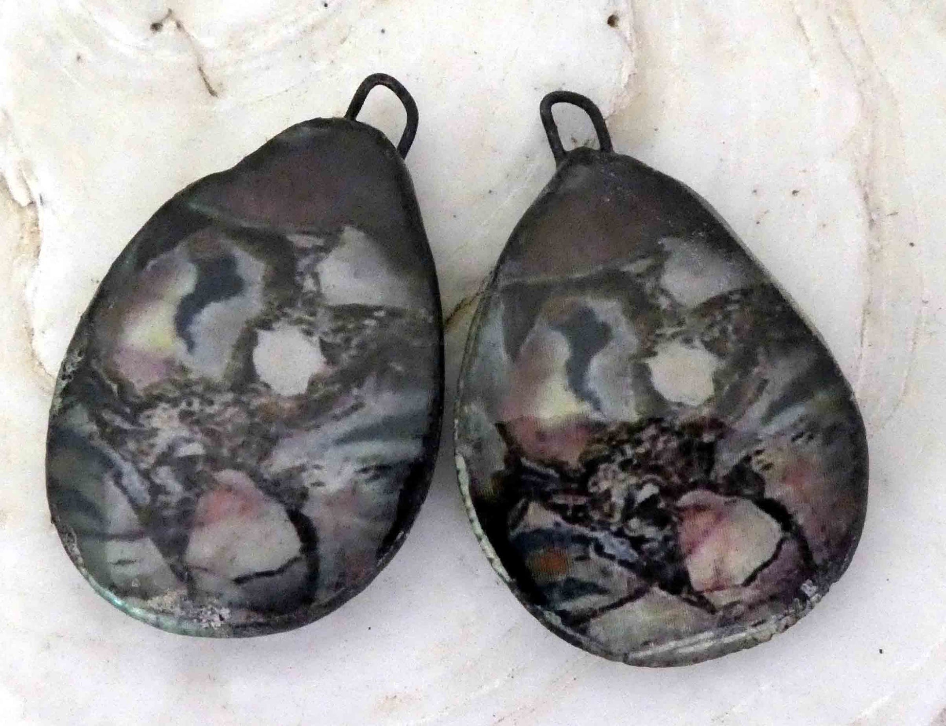 A pair of lightweight droppers. Hand formed, super slim droppers, fired with gloss glaze and Bronze clay. Then applied with Gemstone decals and fired again with Lustre. Scorched to a rainbow finish on the backs. 30mms, and very lightweight. ©ScorchedEarthDesigns