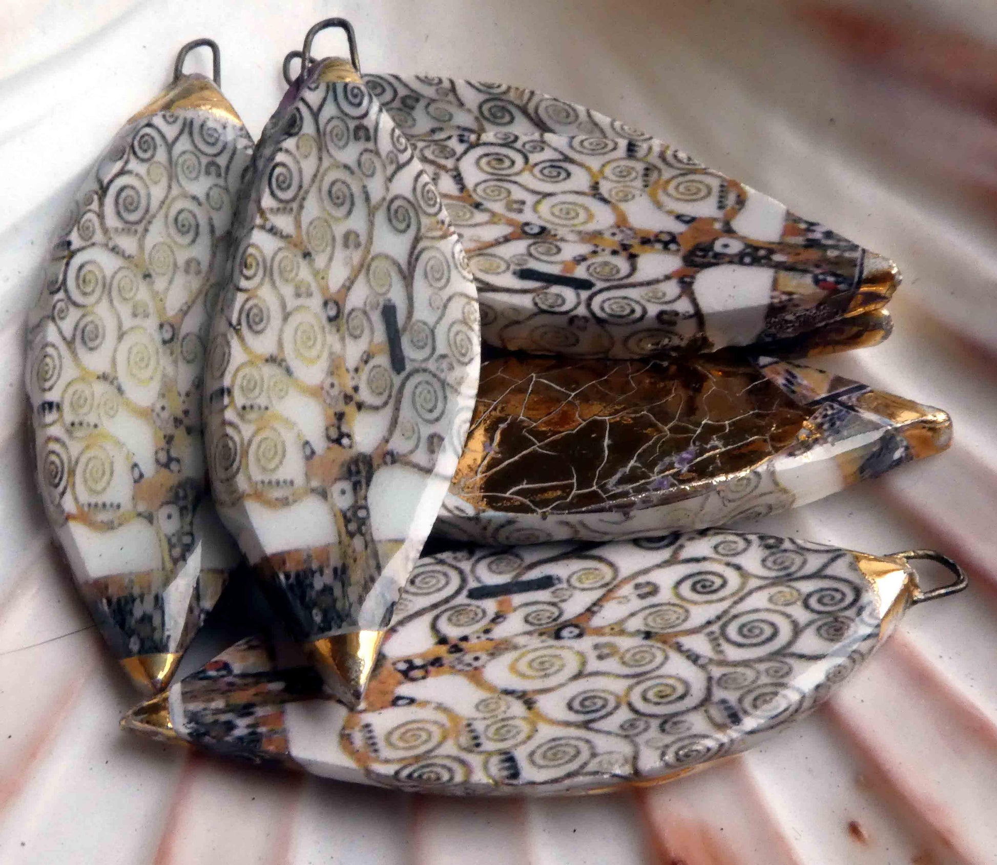 A pair of lightweight feminine droppers. Hand formed, droppers in Earthstone, high fired. Then fired again with gloss glaze and bronze clay. Applied with beautiful matching Klimt print ceramic decals and Gold Lustre, then fired again 40mms, and lightweight. Scorched on the backs to a rainbow finish. ©ScorchedEarthDesigns