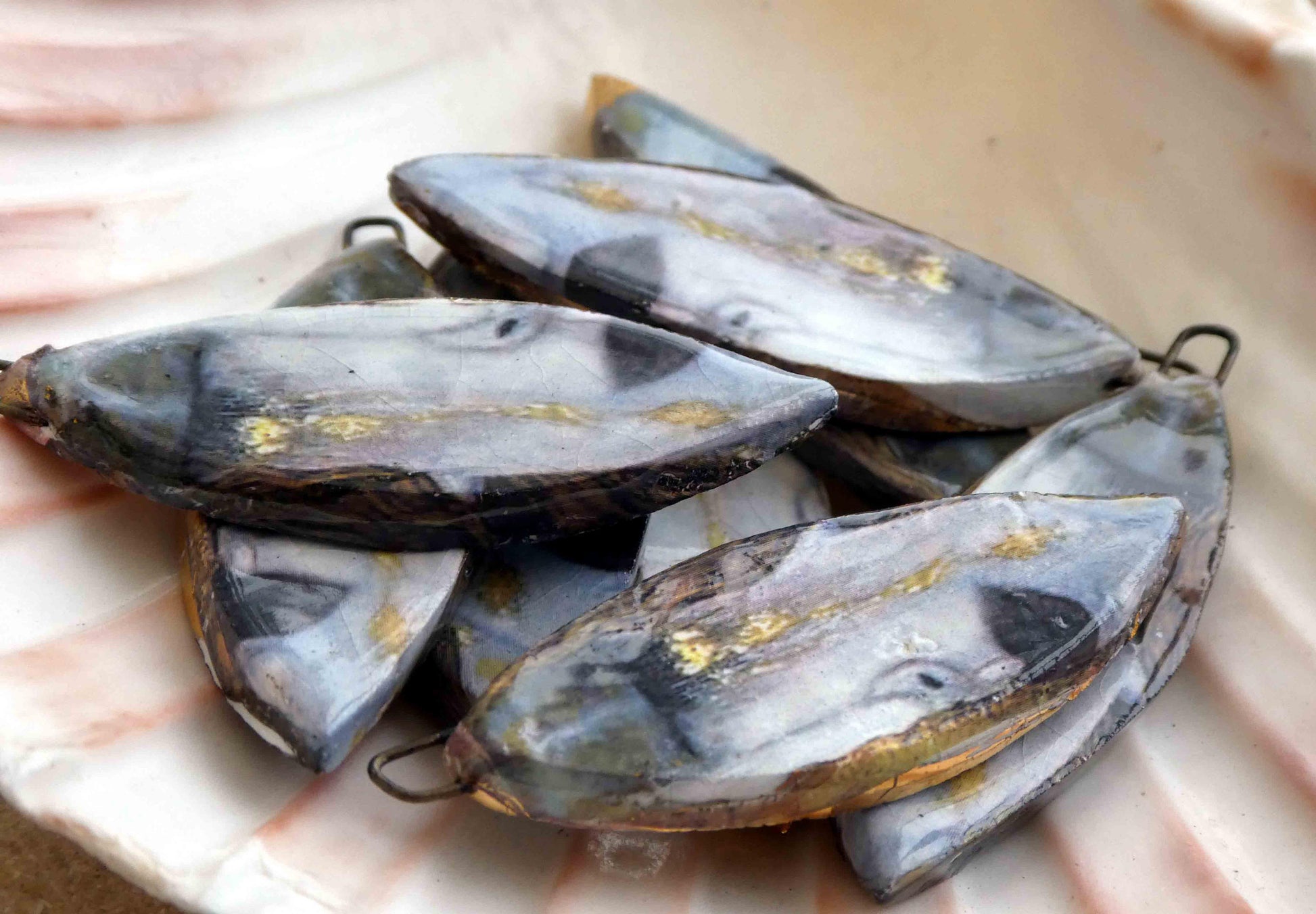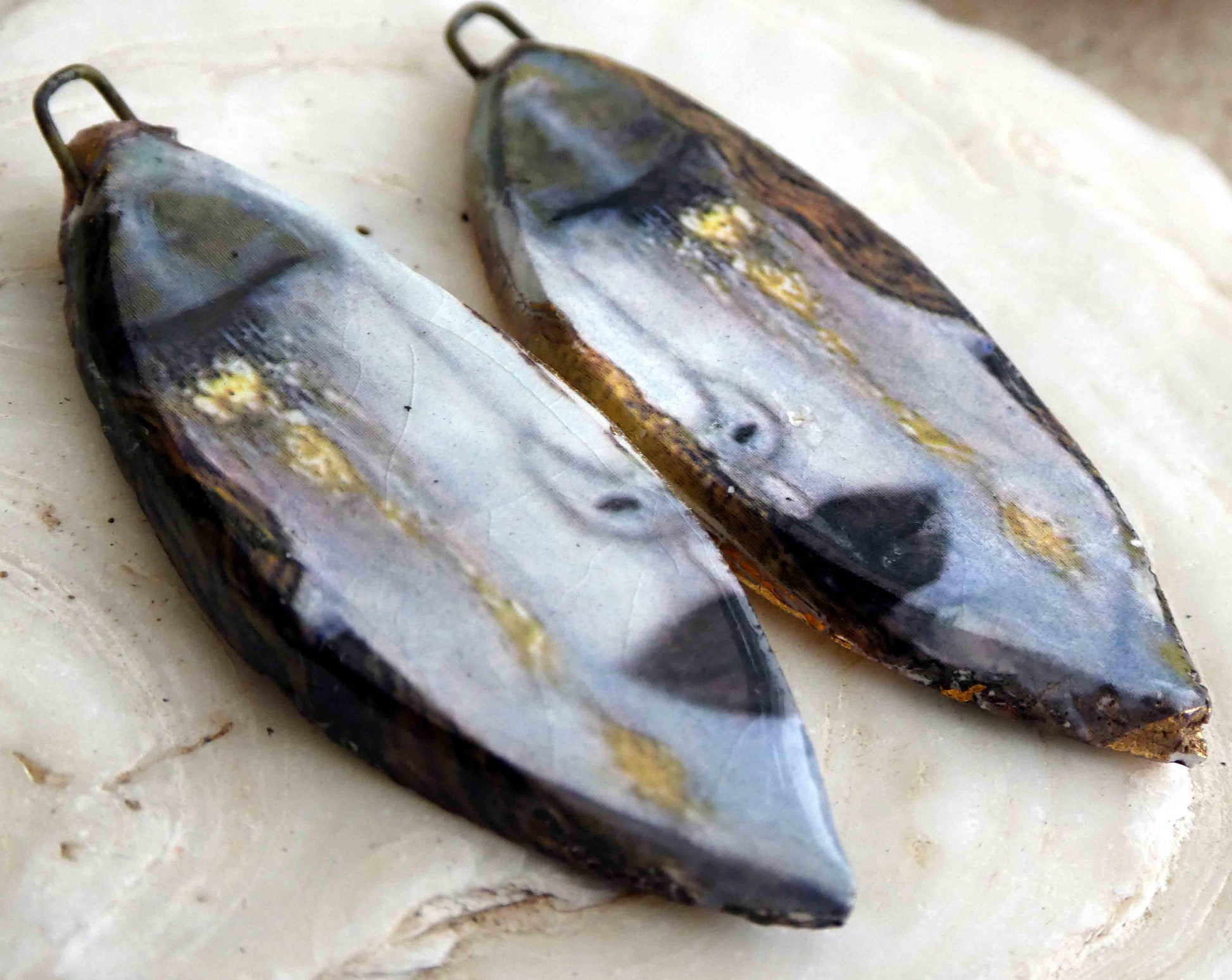 A pair of lightweight feminine droppers. Hand formed, droppers in Earthstone, high fired. Then fired again with gloss glazeand bronze clay. Applied with beautiful matching Klimt inspired print ceramic decals, then fired again. Scorched on the backs to a rainbow finish.