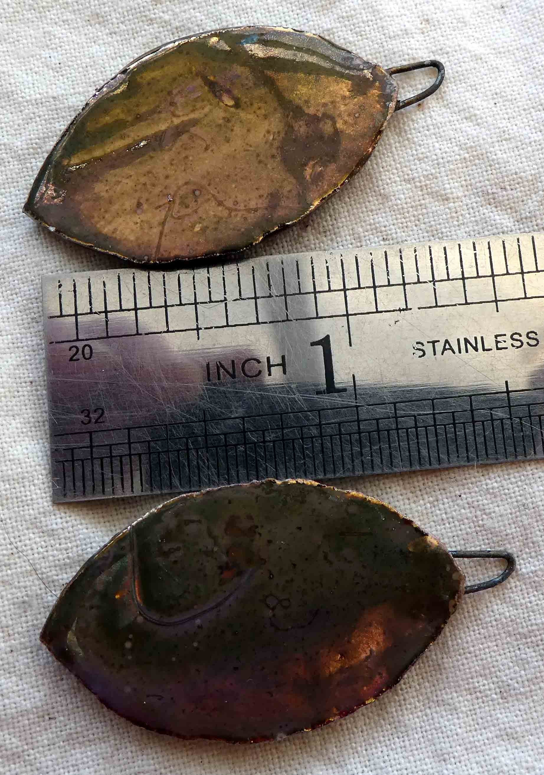 A pair of lightweight feminine droppers. Hand formed, droppers in Earthstone, high fired. Then fired again with glossy glaze. Then applied with beautiful matching Mucha decals and Bronze Lustre, then fired again. 40mms, and lightweight. ©ScorchedEarthDesigns