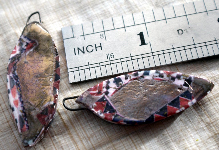 A pair of lightweight feminine droppers. Hand formed, droppers in Bone China, high fired. Then fired again with Matte and Crackle glaze. Then applied with beautiful matching Picasso decals and Bronze Lustre, then fired again. 40mms, and lightweight.