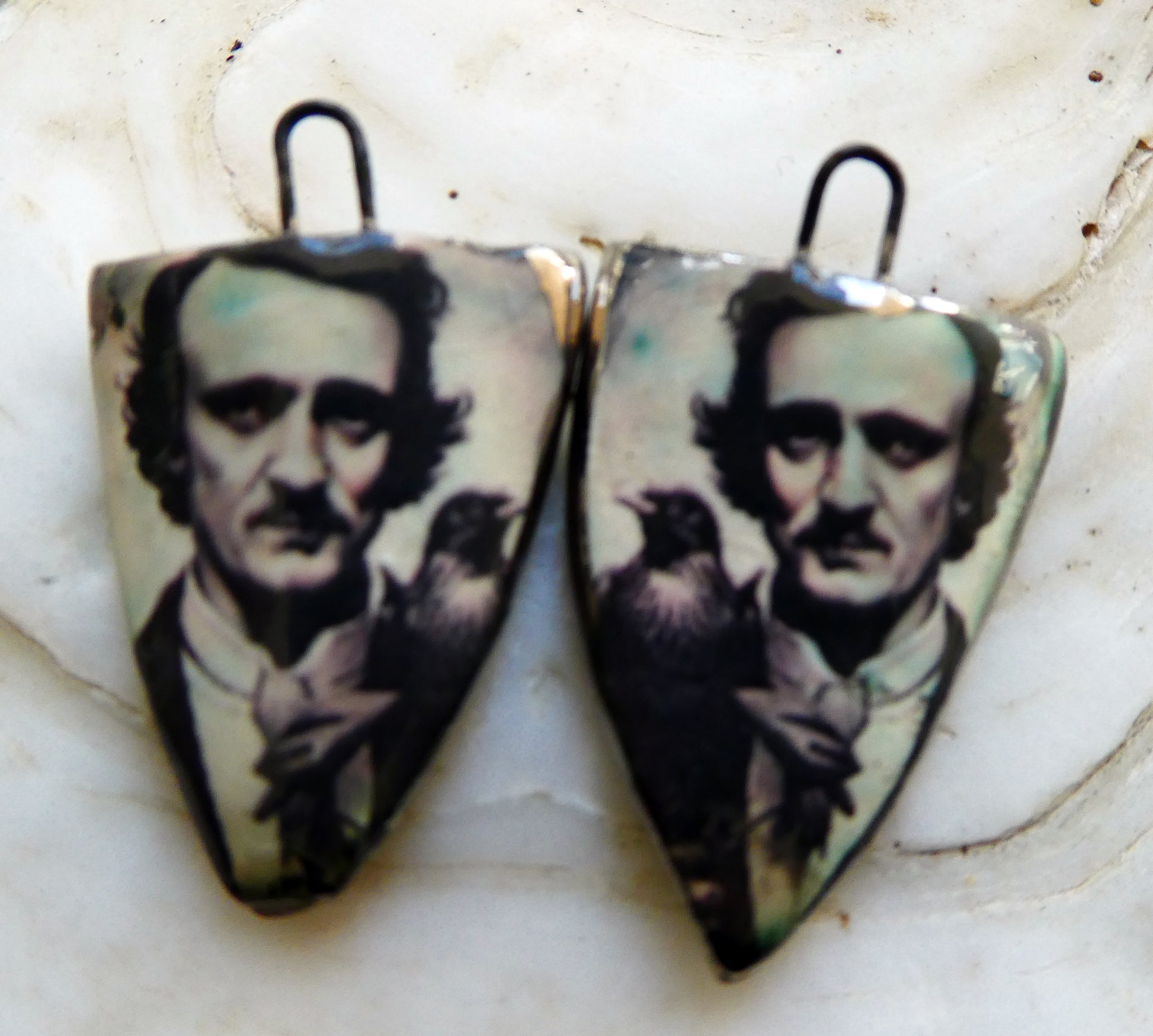 Hand formed in Earthstone, and high fired. Then fired again with bronze clay and Gloss glaze. Applied with decals and fired again. Scorched on the backs to a coppery rainbow finish.