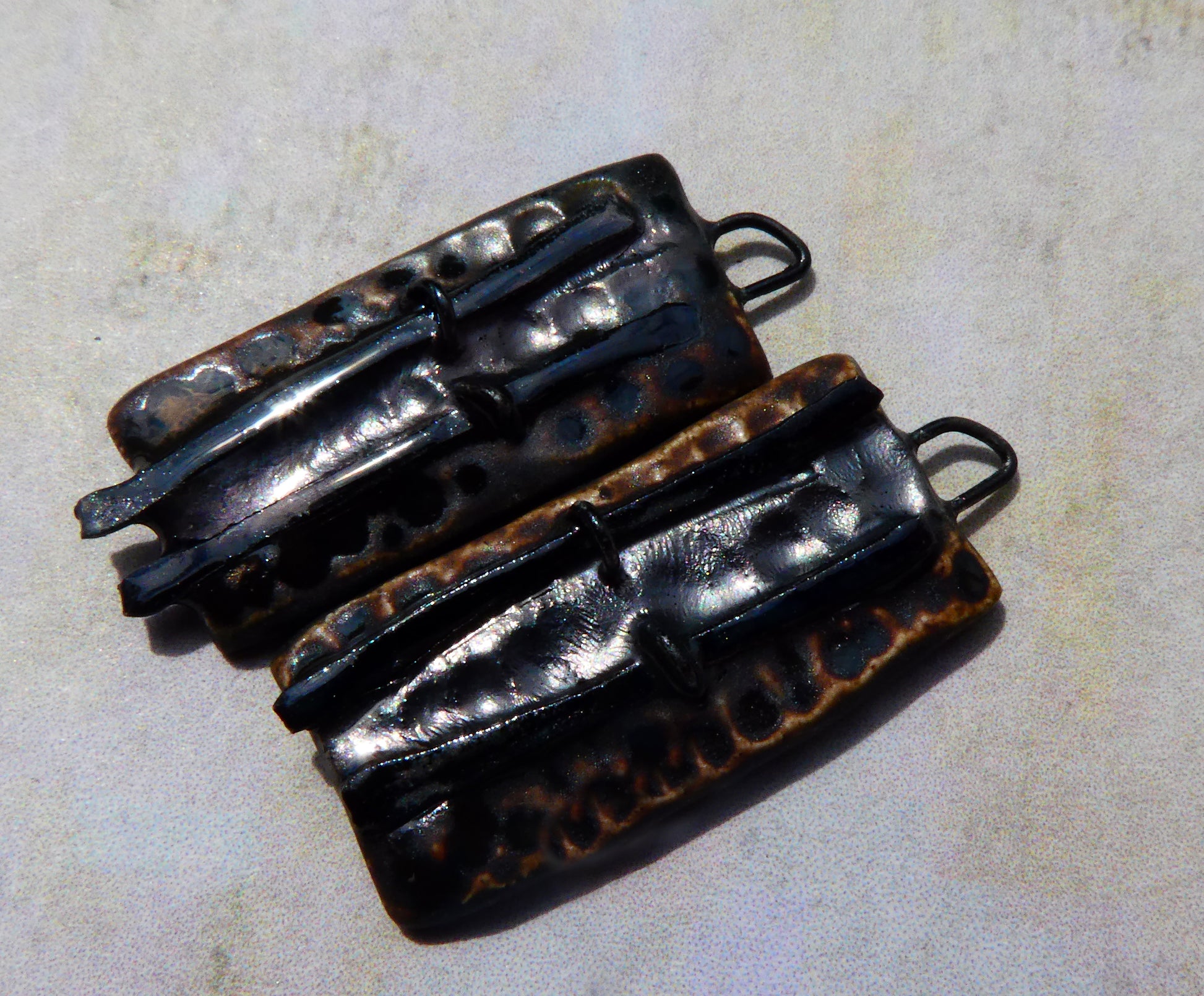 Hand formed in Earthstone and high fired with stapled, hammered steel sticks. Then fired again with bronze clay, Pewter and Glossy Gold glaze.