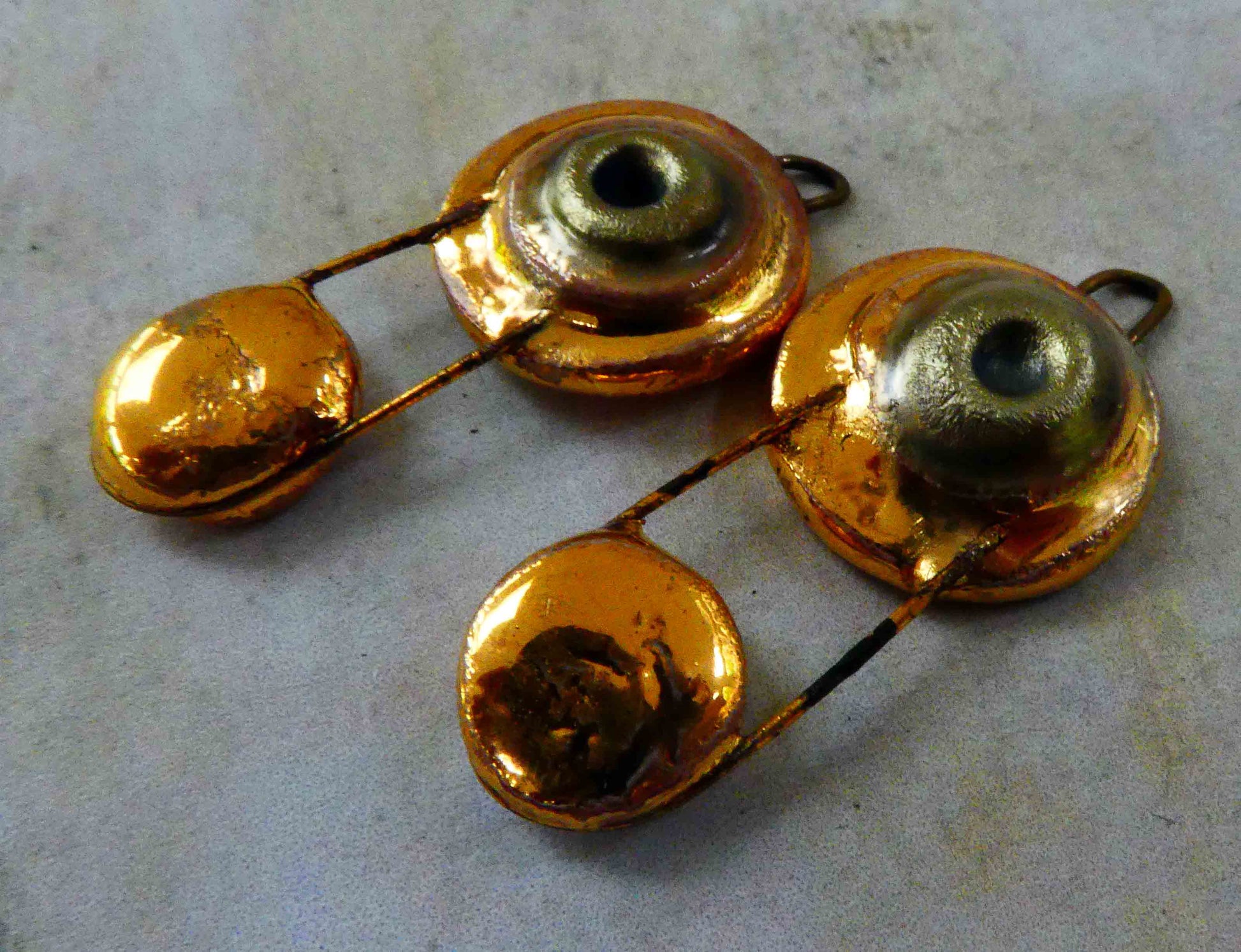 Hand formed in Earthstone and high fired. Then fired again with bronze clay and Gloss glaze. Applied with Gold Lustre, and fired again.