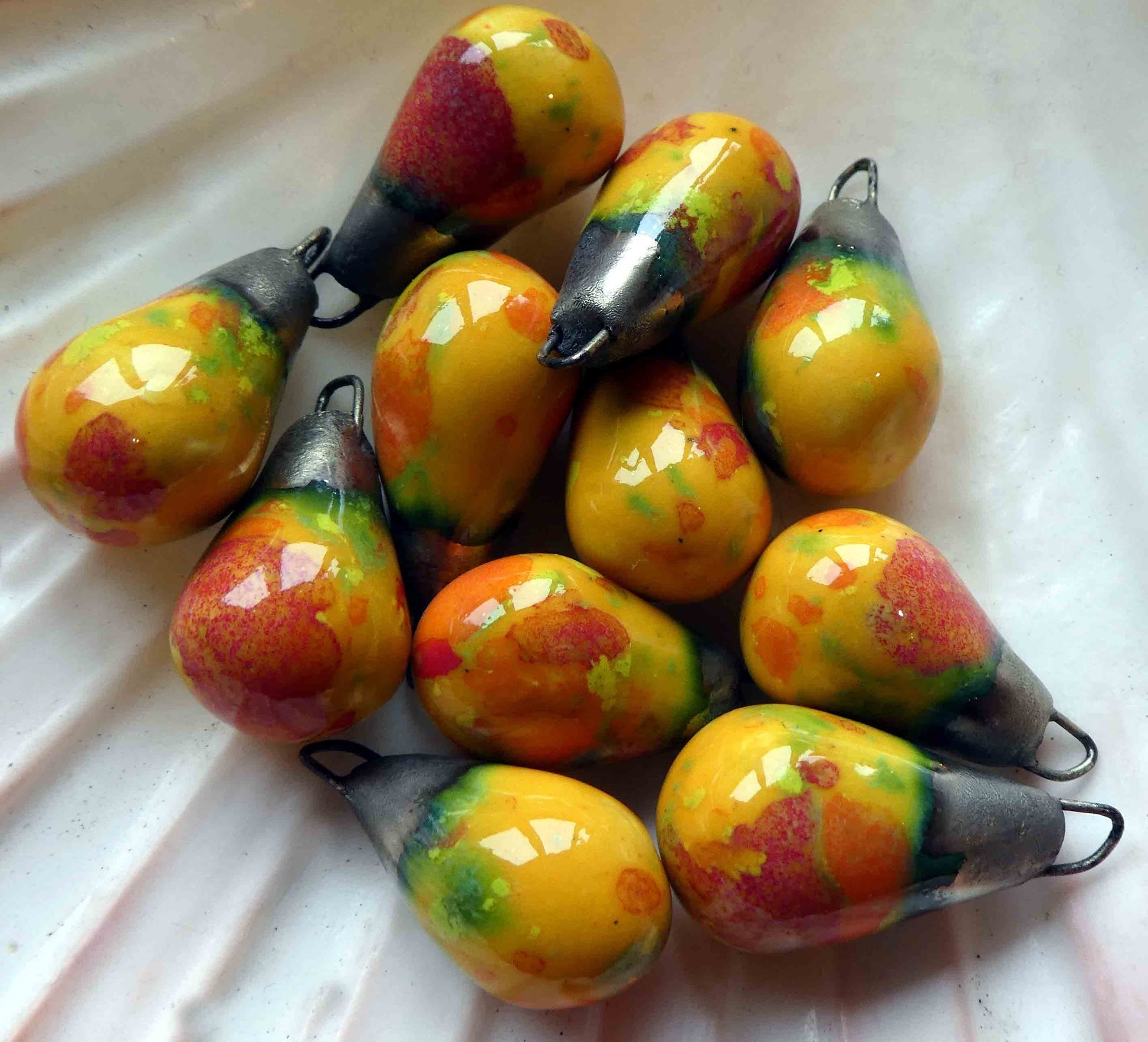 A pair of glazed droplets on hoops. Hand formed in Earthstone , and fired with Bronze clay and Sassy Orange glaze. All slightly different, but on average 20mms plus the hoop, and very lightweight. ©ScorchedEarthDesigns