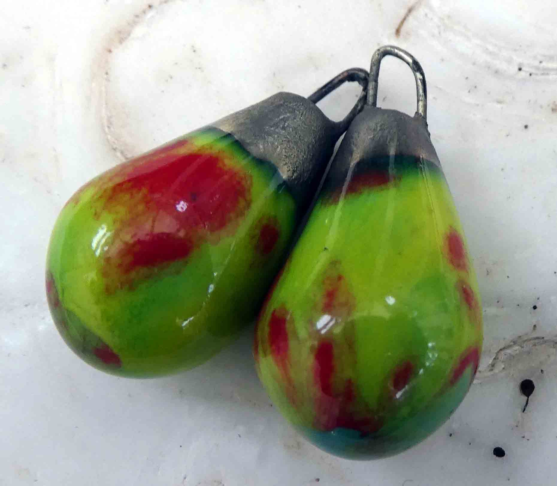 A pair of glazed droplets on hoops. Hand formed in Earthstone , and fired with Bronze clay and Appltini glaze. All slightly different, but on average 20mms plus the hoop, and very lightweight. ©ScorchedEarthDesigns