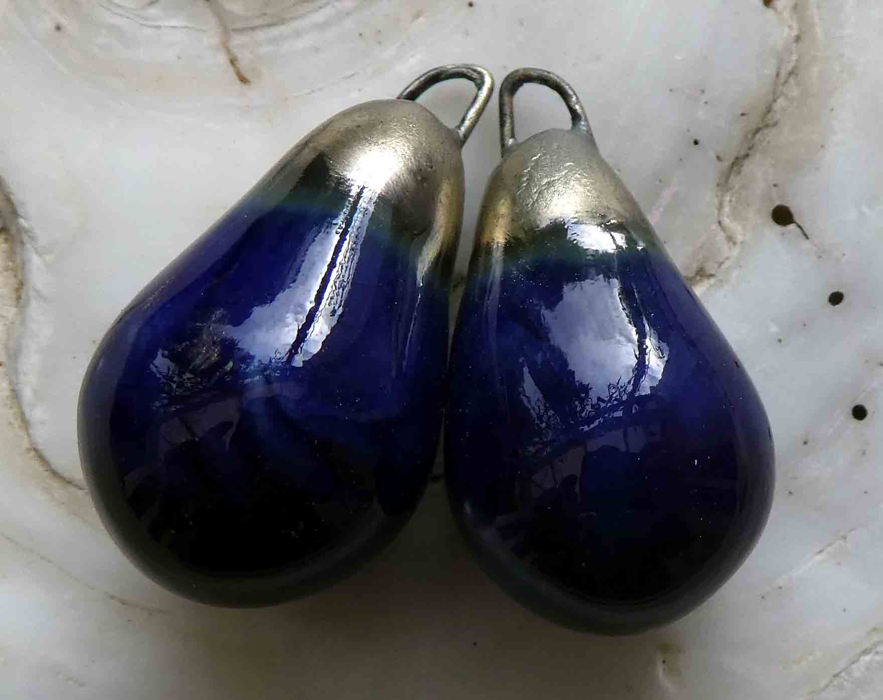 A pair of glazed droplets on hoops. Hand formed in Earthstone, and fired with Bronze clay and Mirror Blue glaze. 20mms, and very lightweight. ©ScorchedEarthDesigns