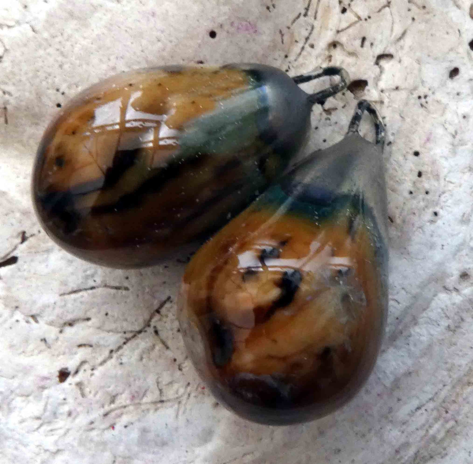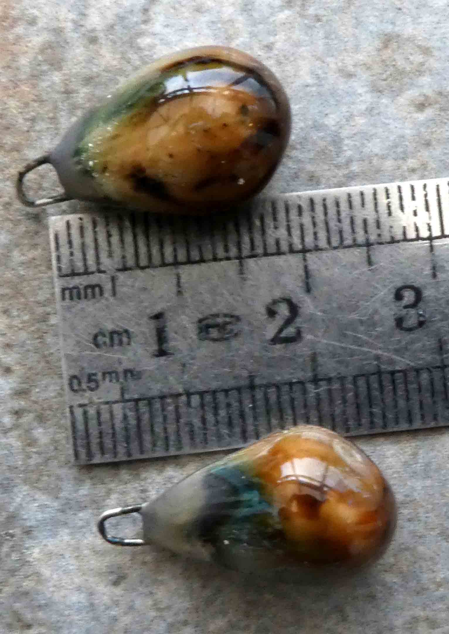 A pair of glazed droplets on hoops. Hand formed in Earthstone , and fired with Bronze clay and Oriental Caramel glaze. All slightly different, but on average 20mms plus the hoop, and weigh just a gramme each.