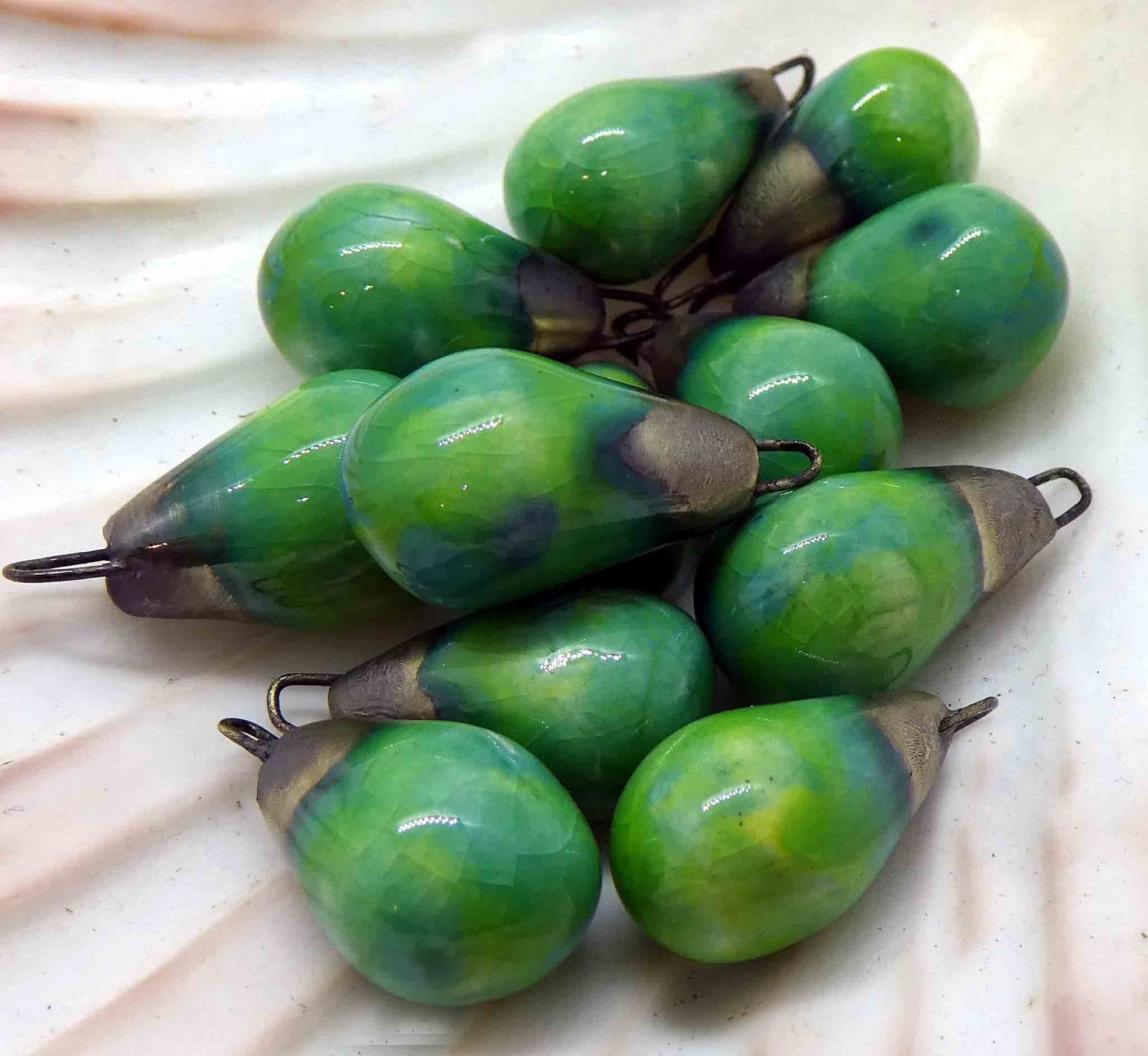 A pair of glazed droplets on hoops. Hand formed in Earthstone, and fired with Bronze clay, and Caribbean Lime glaze. All slightly different, but on average 20mms. ©ScorchedEarthDesigns