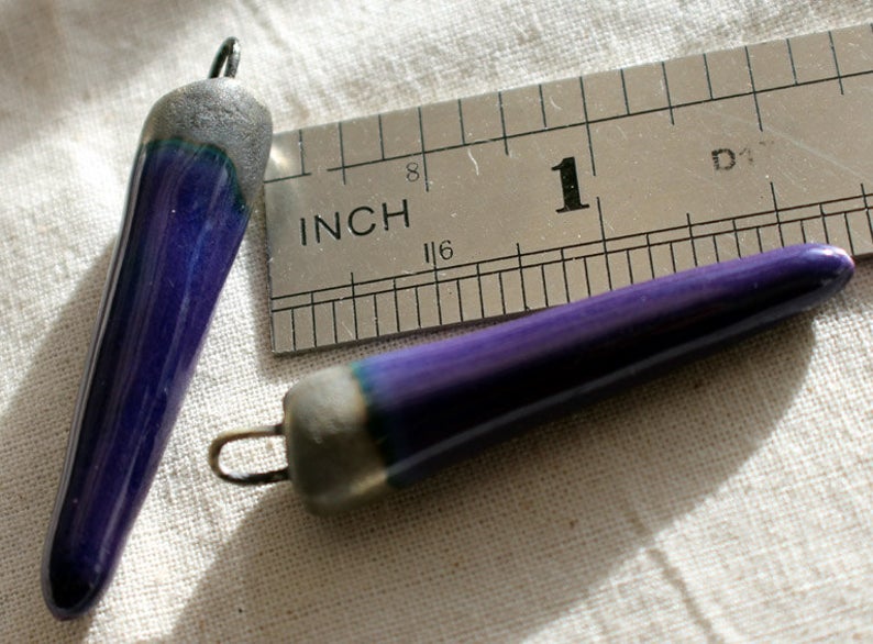 A pair of glazed spikes on hoops. Hand formed in Southern ice Porcelain, and fired with Bronze clay, and Dark Purple glaze. All slightly different, but roughly 20mms in length, and very lightweight. ©ScorchedEarthDesigns
