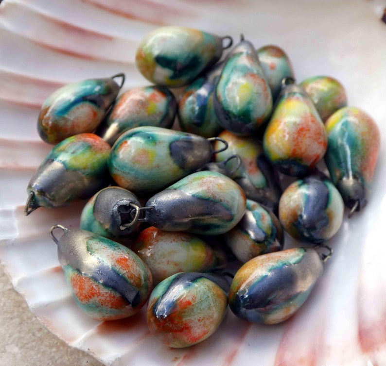 A pair of glazed drops on hoops. Hand formed in Southern ice Porcelain, and fired with Bronze clay, and Tiger Lily glaze. All slightly different, but roughly 20mms in length, and very lightweight. ©ScorchedEarthDesigns