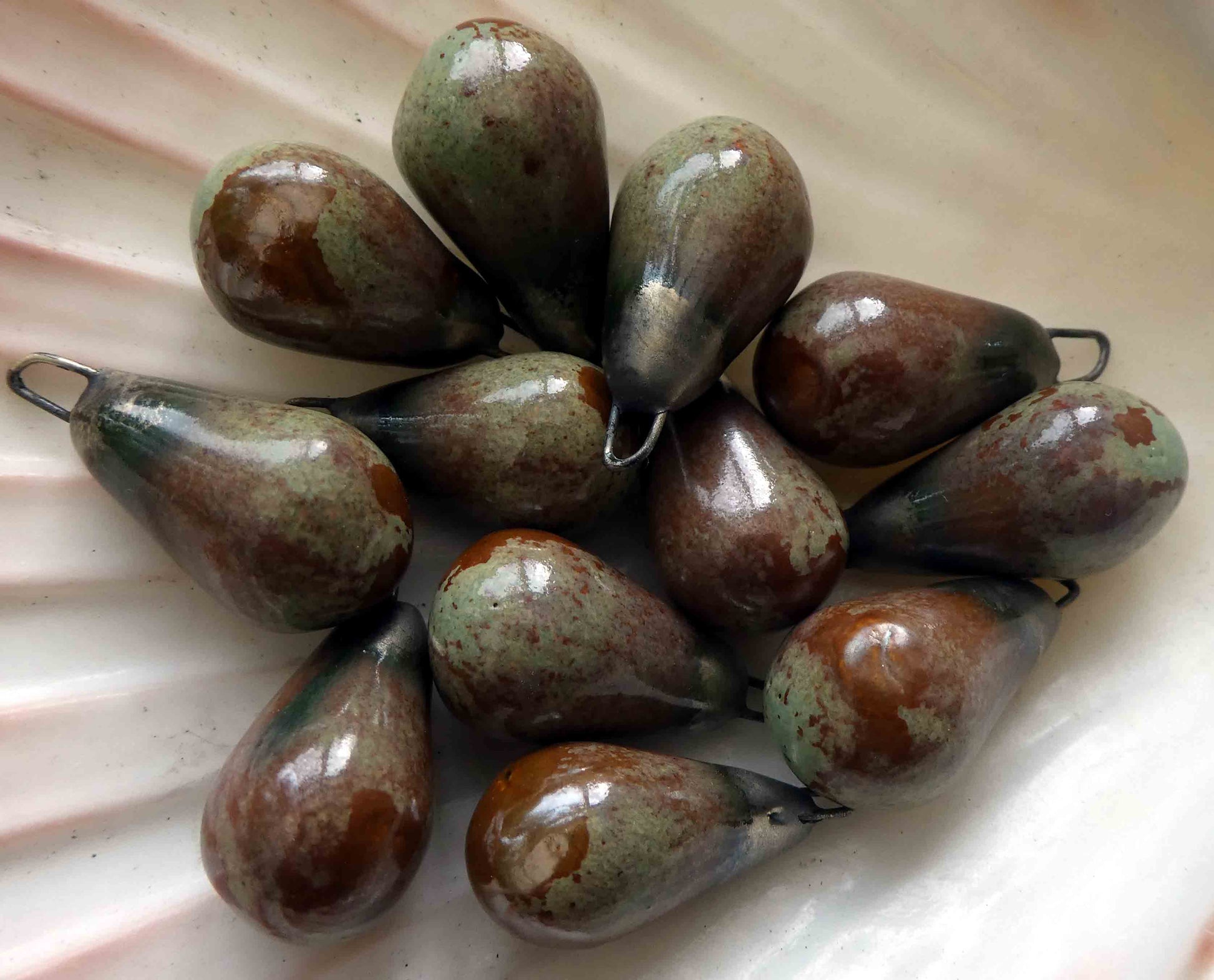 A pair of glazed droplets on hoops. Hand formed in Earthstone, and fired with Bronze clay and Muddy Waters glaze. 20mms, and very lightweight. ©ScorchedEarthDesigns