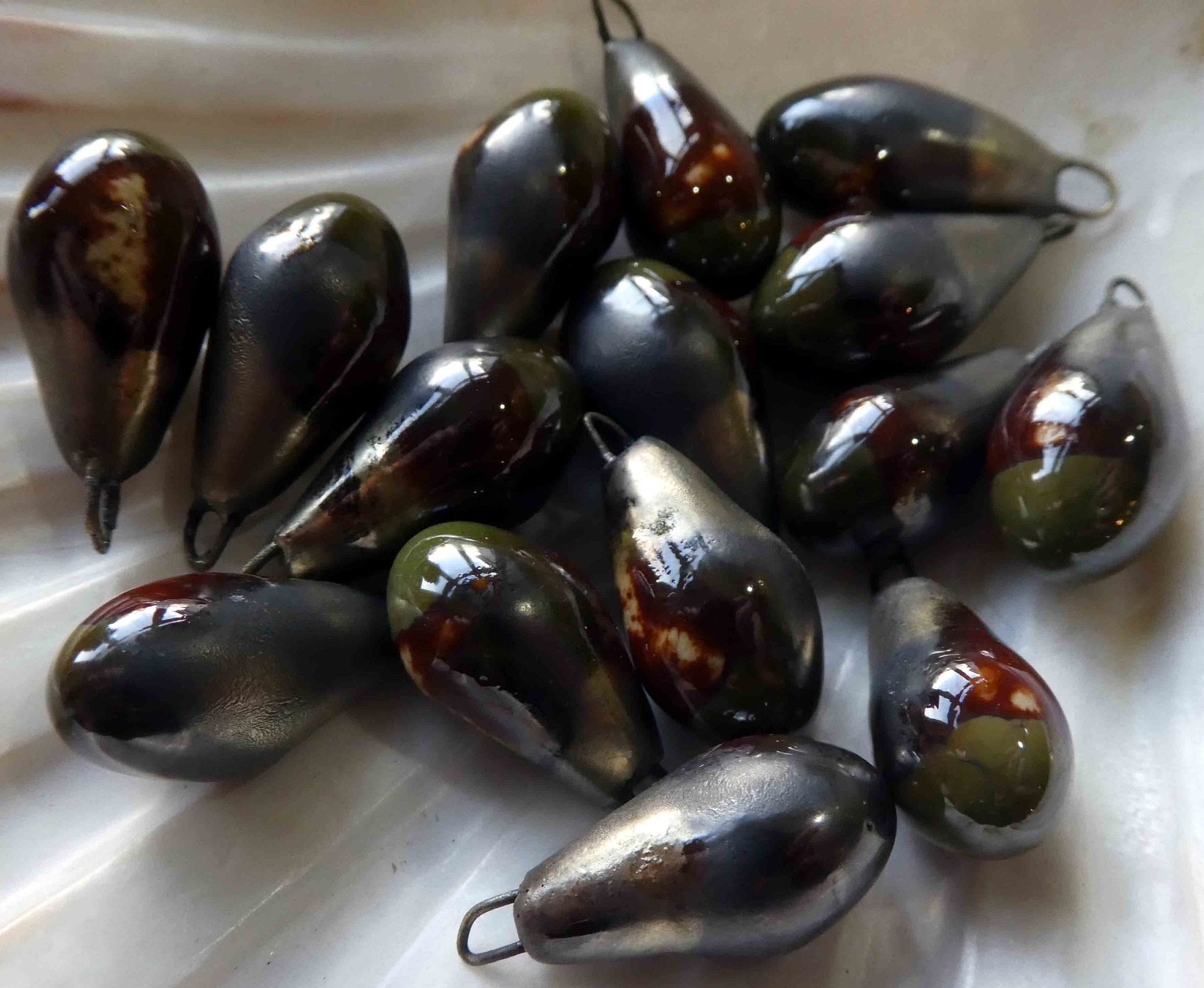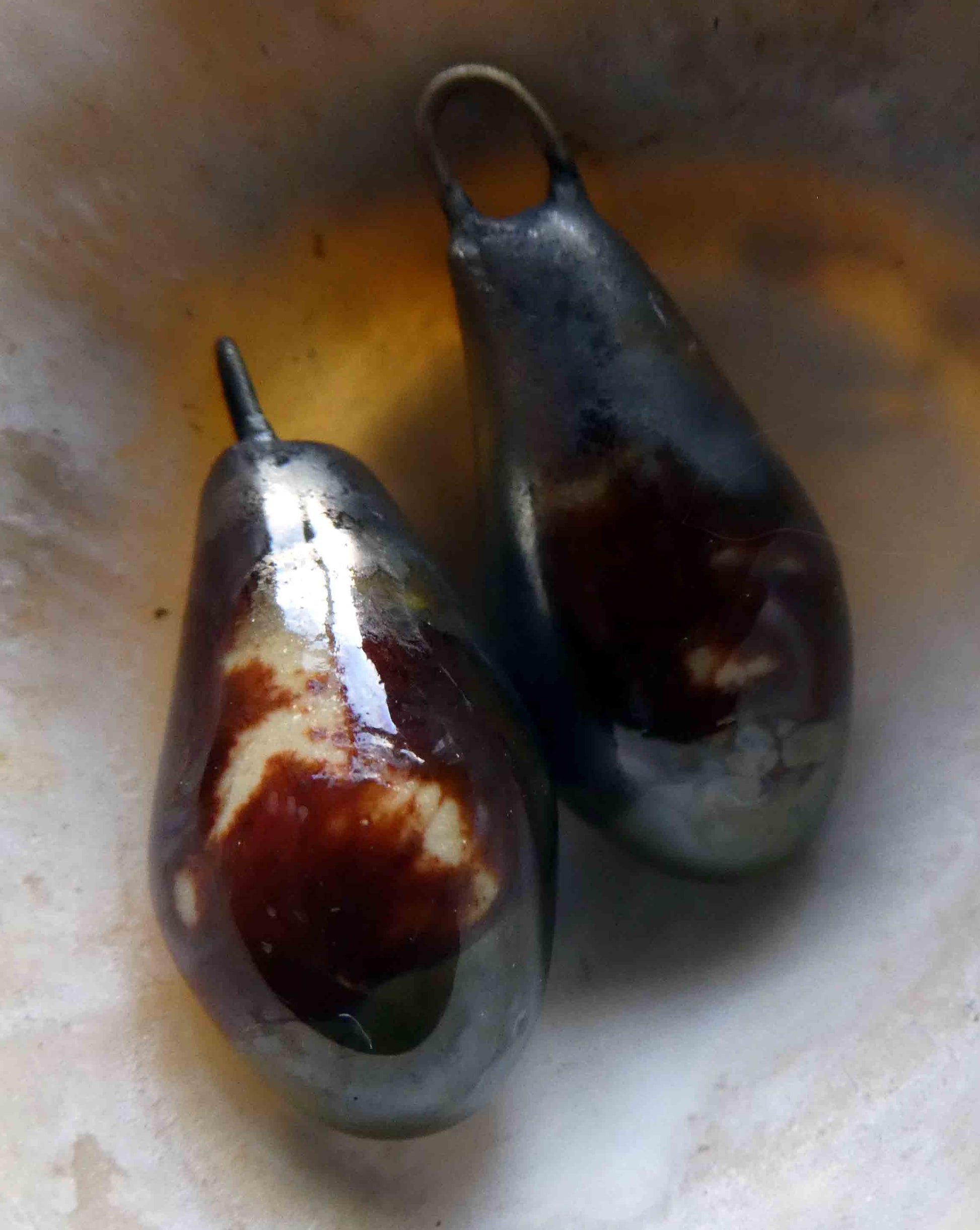 A pair of glazed drops on hoops. Hand formed in Earthstone, and high fired with Bronze clay, and Muddy Waters glaze. They're all slightly different, but on average are 20mms. ©ScorchedEarthDesigns