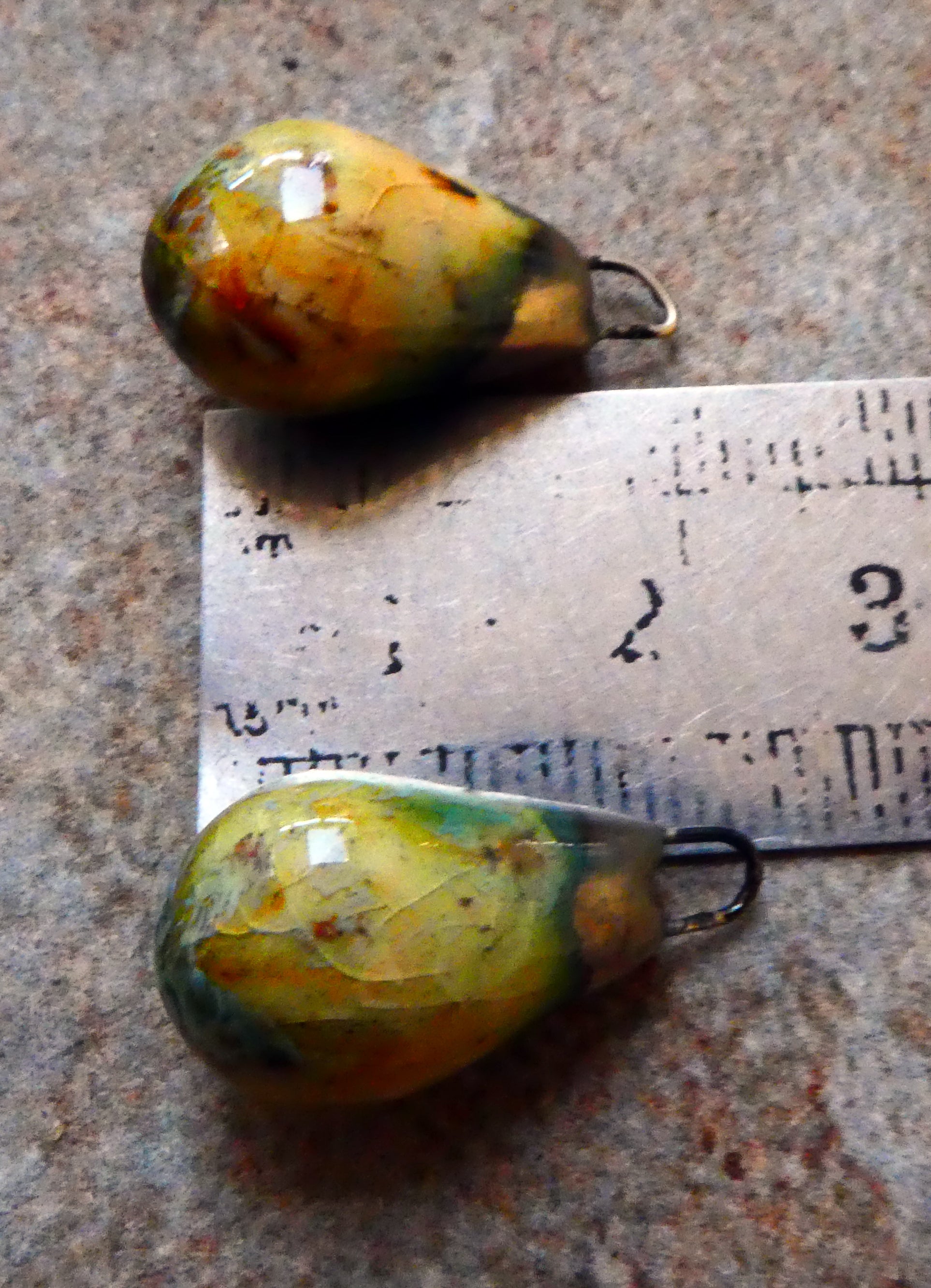 A pair of glazed droplets on hoops. Hand formed in Earthstone , and fired with Bronze clay and Cappucino Mint glaze. All slightly different, but on average 20mms plus the hoop, and weigh just a gramme each.
