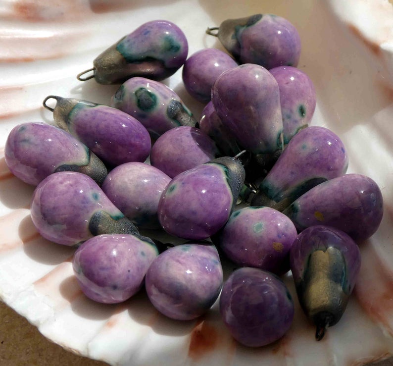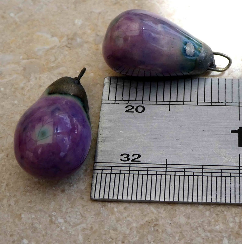 A pair of glazed drops on hoops. Hand formed in Southern ice Porcelain, and fired with Bronze clay, and Grapel glaze. All slightly different, but roughly 20mms in length, and very lightweight. ©ScorchedEarthDesigns