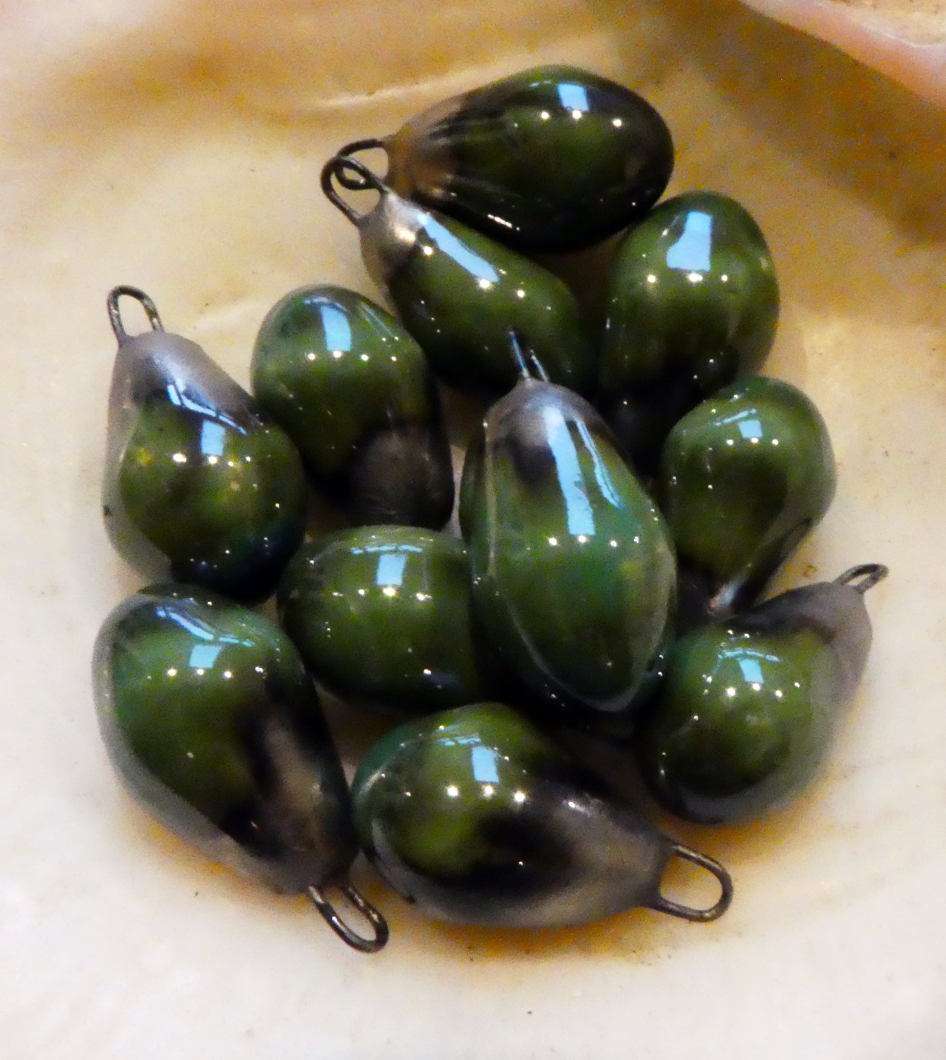 A pair of glazed drops on hoops. Hand formed in Earthstone , and fired with Bronze clay and Peacock Green glaze. All slightly different, but on average 20mms plus the hoop, and weigh just a gramme each.