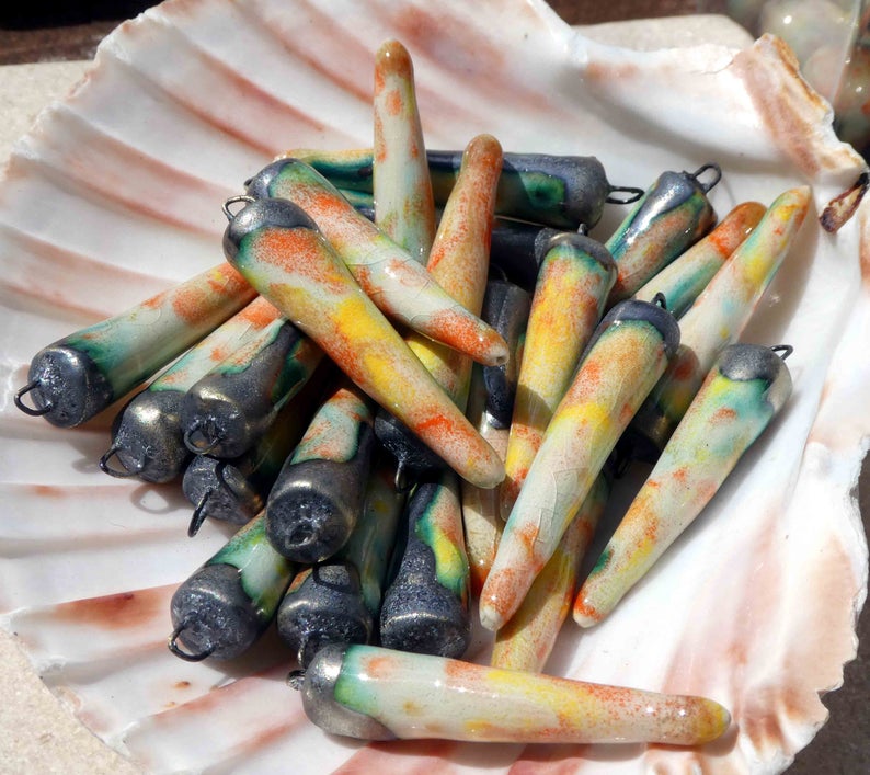A pair of glazed spikes on hoops. Hand formed in Southern ice Porcelain, and fired with Bronze clay, and Tiger Lily glaze. All slightly different, but roughly 35mms in length, and very lightweight. ©ScorchedEarthDesigns