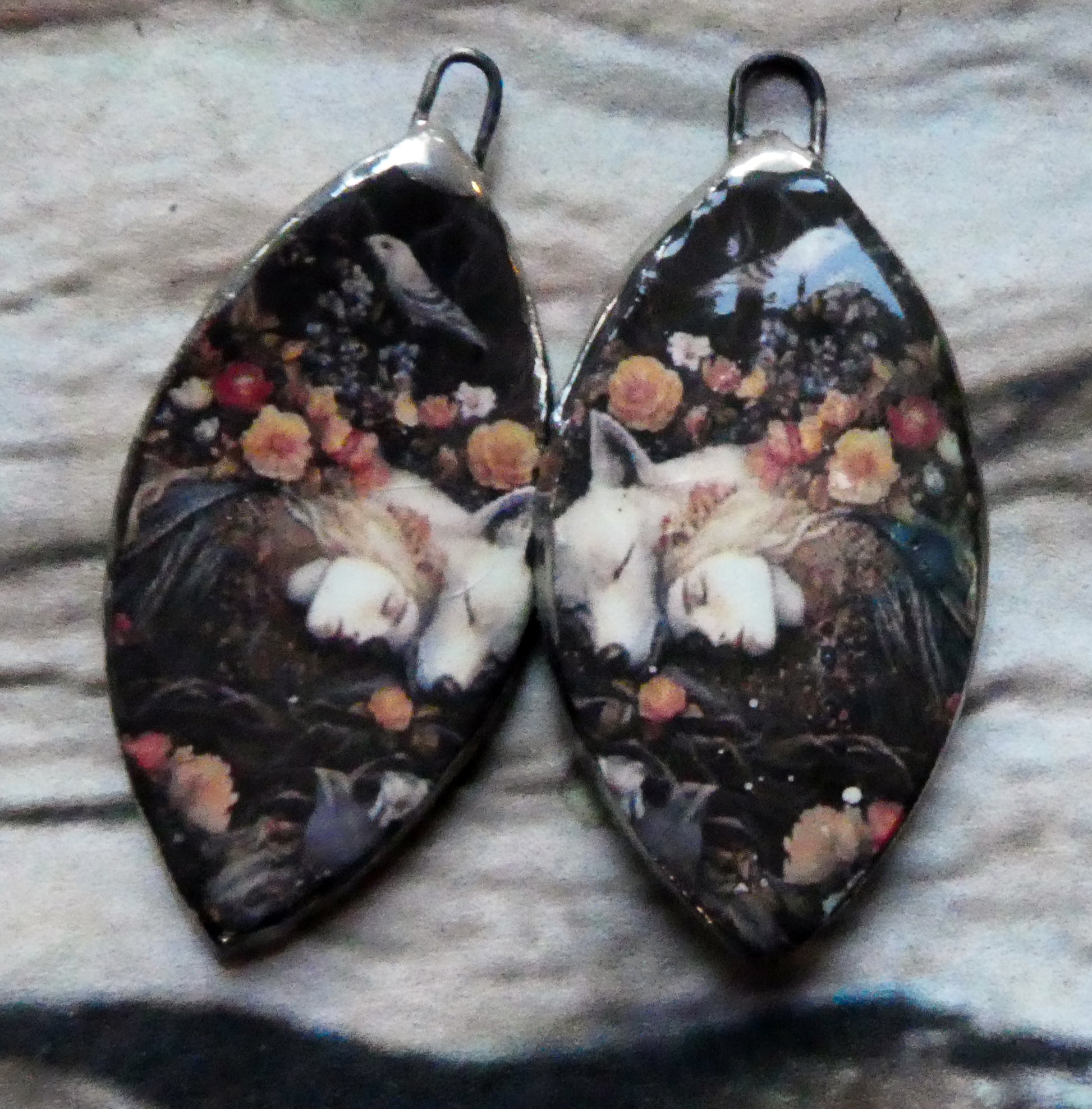 Hand formed drops, fired with gloss glaze and Bronze clay. Then applied with decals and fired again. Applied with lustre and fired once more. Scorched to a rainbow finish on the backs.
