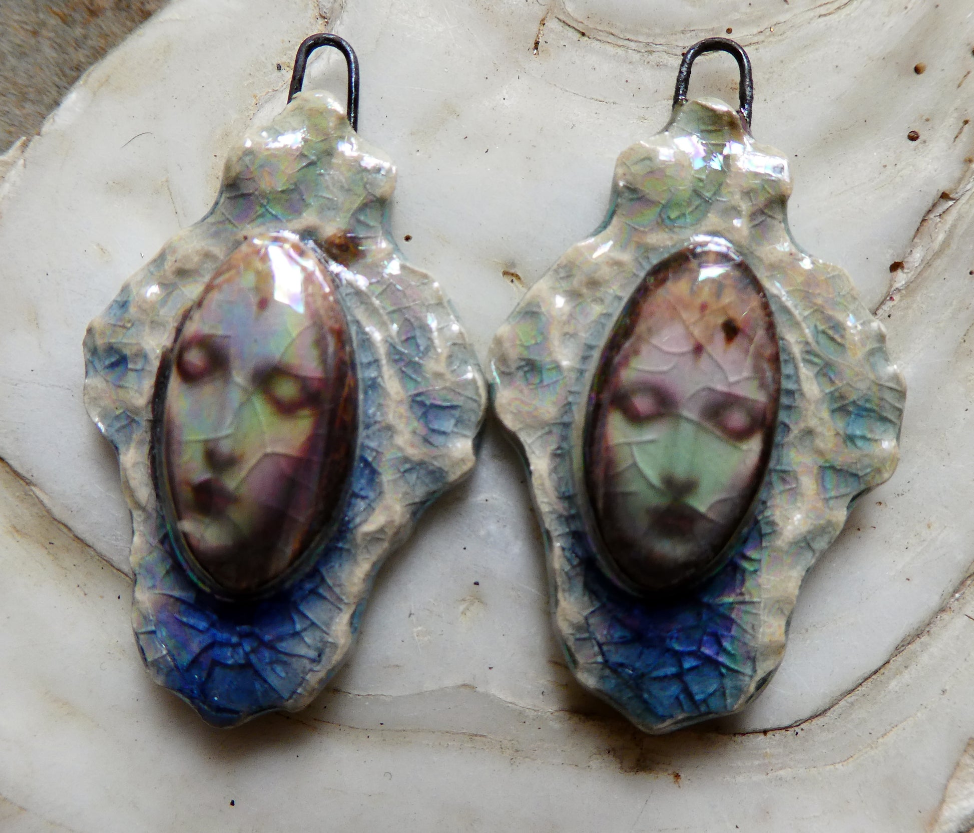 Hand formed in Earthstone and high fired. Then fired with Gloss and Moonscape Crackle glaze. Applied with goddess face decals and fired again, and then a fourth time with Mother of Pearl lustre.